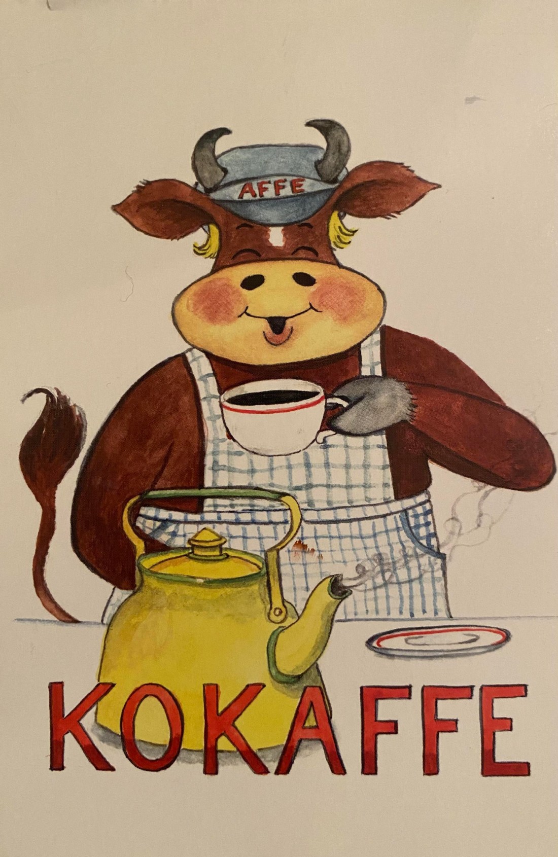 Jag fick detta ljuvliga vykort med posten och blev jätteglad. Det kom från min mammas kusin Lena som jag besökte för en tid sen. Jag gillar dessa motiv från Glada Kossan. Det är vitsigt värre. Det är Affe som kokar kaffe, alltså är det Kok-Affe men vad kokar han? Han kokar kok-kaffe och kaffe som är kokat av en ko kallas då ko-kaffe.