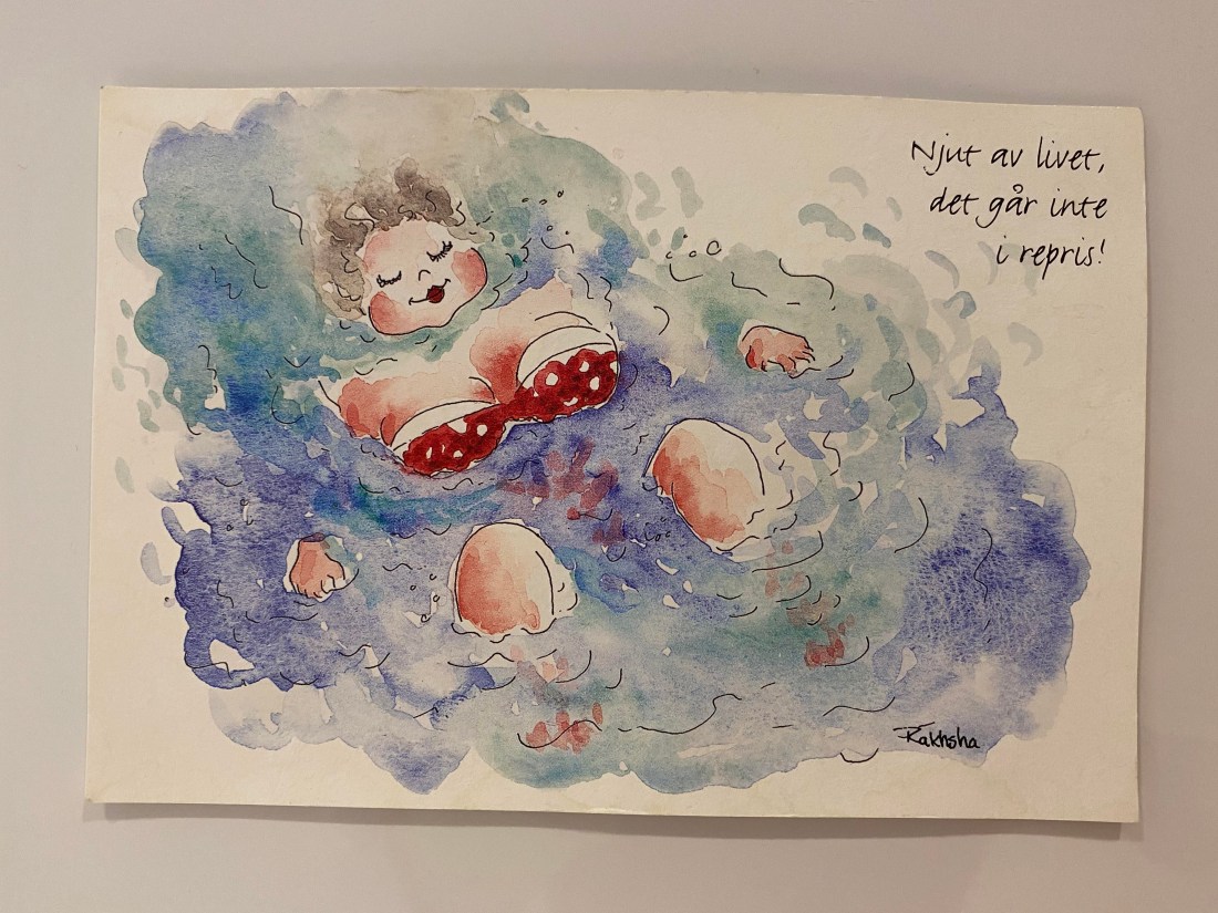Njut av livet, det går inte i repris! Så lyder texten på detta kort som jag har uppsatt i badrummet intill badkaret. Jag tycker det är tänkvärt. Kvinnan på bilden ser ut att njuta av badet och jag vill själva påminna mig om att njuta av de små stunderna.