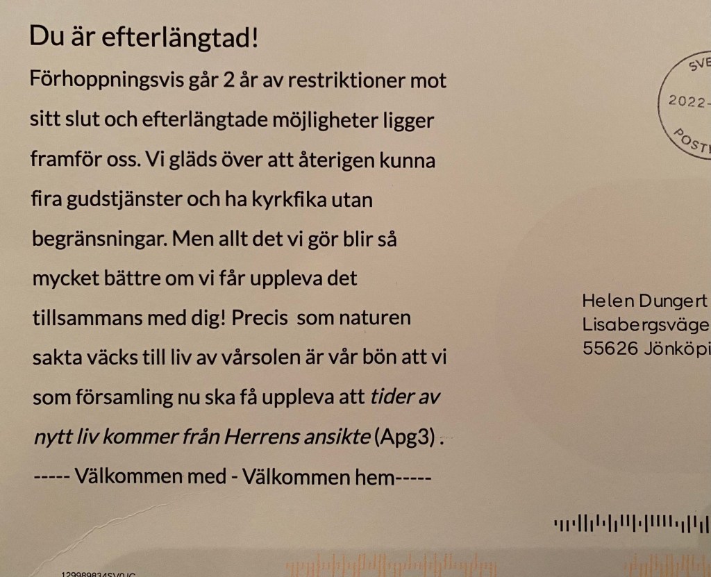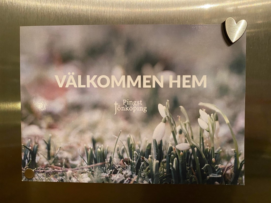 Jag fick ett vykort som gjorde mig glad. Det kom från min församling, Pingstförsamlingen i Jönköping. Det stod bl a Välkommen hem! Du är efterlängtad. Nu pryder det mitt kylskåp. Under coronapandemin har kyrkan varit stängd under långa perioder och ibland har man fått vistas där i mindre grupper. Nu har restriktionerna släppts och förhoppningsvis kan vi träffas igen.