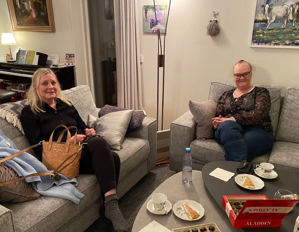 Vi hade en trevlig kväll med mat, prat och fika. Här sitter Marie och Yvonne redo att intaga kaffe med dopp. Vänner gör livet rikt.