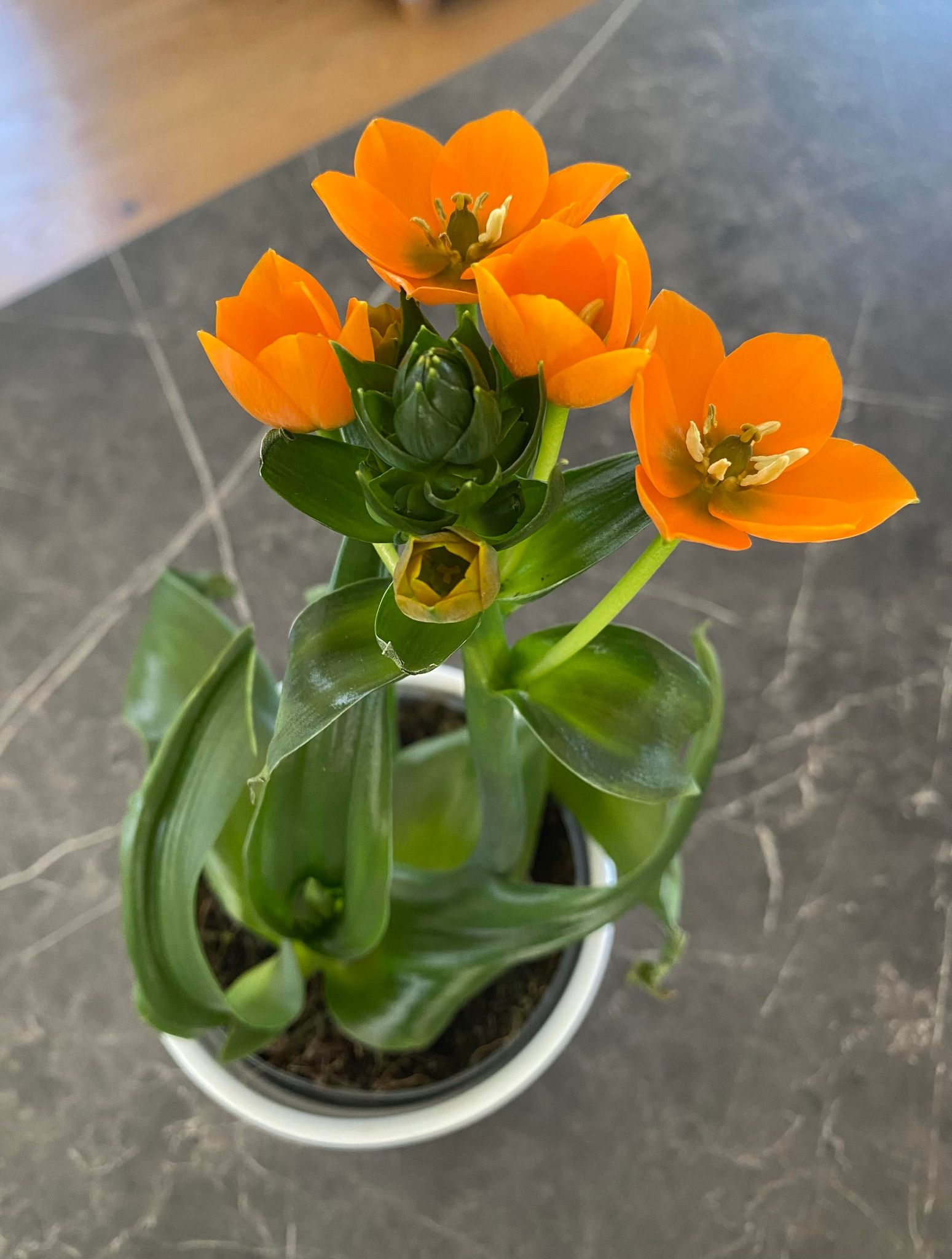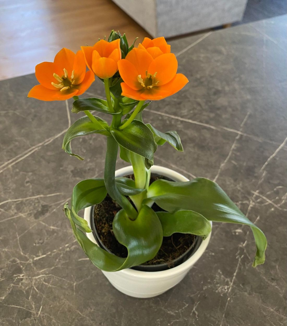 Ikväll har ett par goda vänner varit här och jag fick en jättesöt växt som jag inte har haft tidigare. Den heter Ornithogalum dubium och på svenska är det orange stjärnlök. Den kommer från Sydafrika.