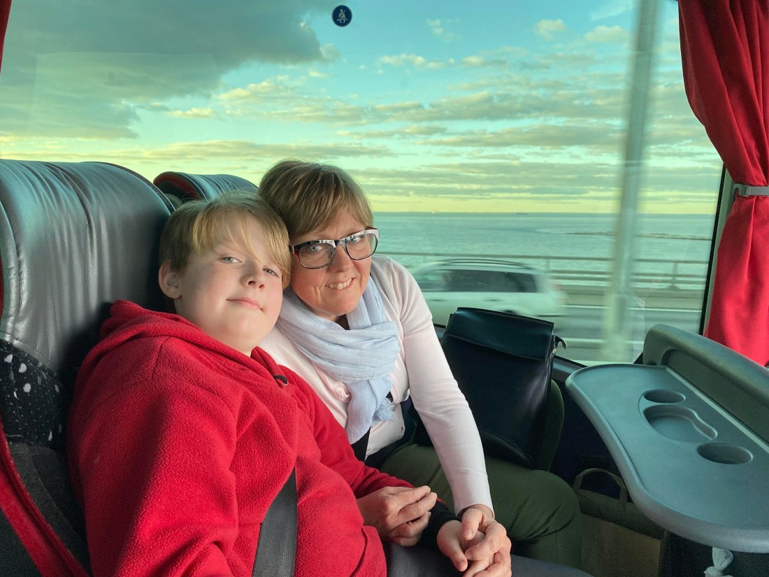 När vi åkte över Öresundsbron passade jag på att ta en fin bild på Kristin och Dennis som satt längst fram i bussen denna dag. Jag tycker de är så fina. Kristin är precis som jag uppvuxen i Nybro kommun men bor numera i Växjö med sin familj.