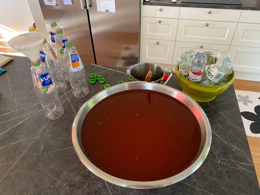 24 timmar har gått sen jag lade rabarber, citroner och citronsyra i vatten. Ikväll har jag silat drycken och tillsatt socker och natriumbensoat samt diskat flaskor. Det blev många liter dryck och nu är den upphälld på flaskor. De flesta flaskor är nu lagda i frysen och några som jag ska ge bort inom kort och även dricka av själv finns i kylen. Jag fryser alltid in rabarberdrycken eftersom man då bara behöver ha halva mängden socker vilket är toppen.