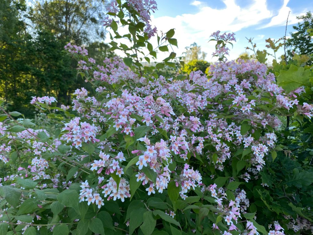 Jag har den senaste veckan stiftat bekantskap med denna otroligt vackra växt. Det är en Paradisbuske. Vilket passande namn! Den kallas också Kolkwitzia. Ser ni vilket fantastiskt mönster som finns i varje blomma? Det måste vara en gudomlig designer som ligger bakom detta. Denna buske skulle jag vilja ha i min trädgård.