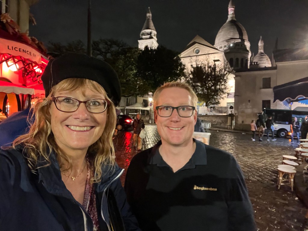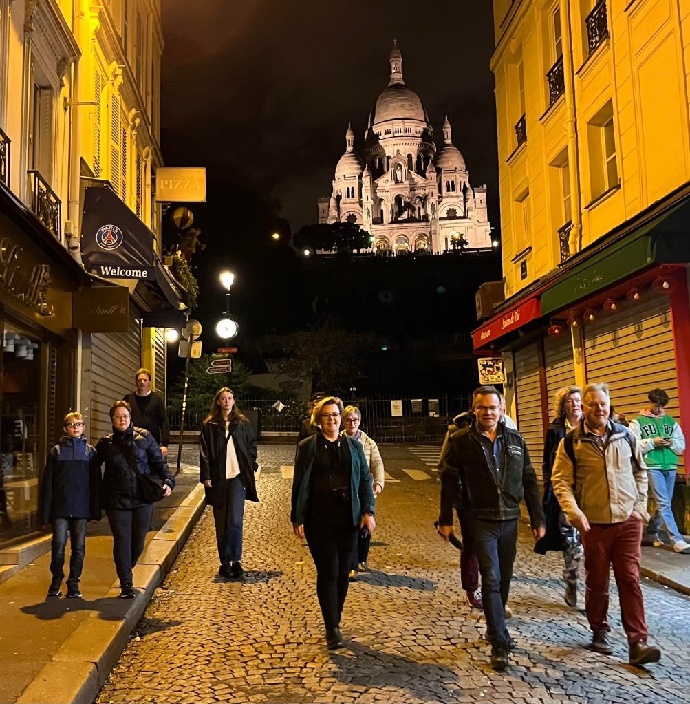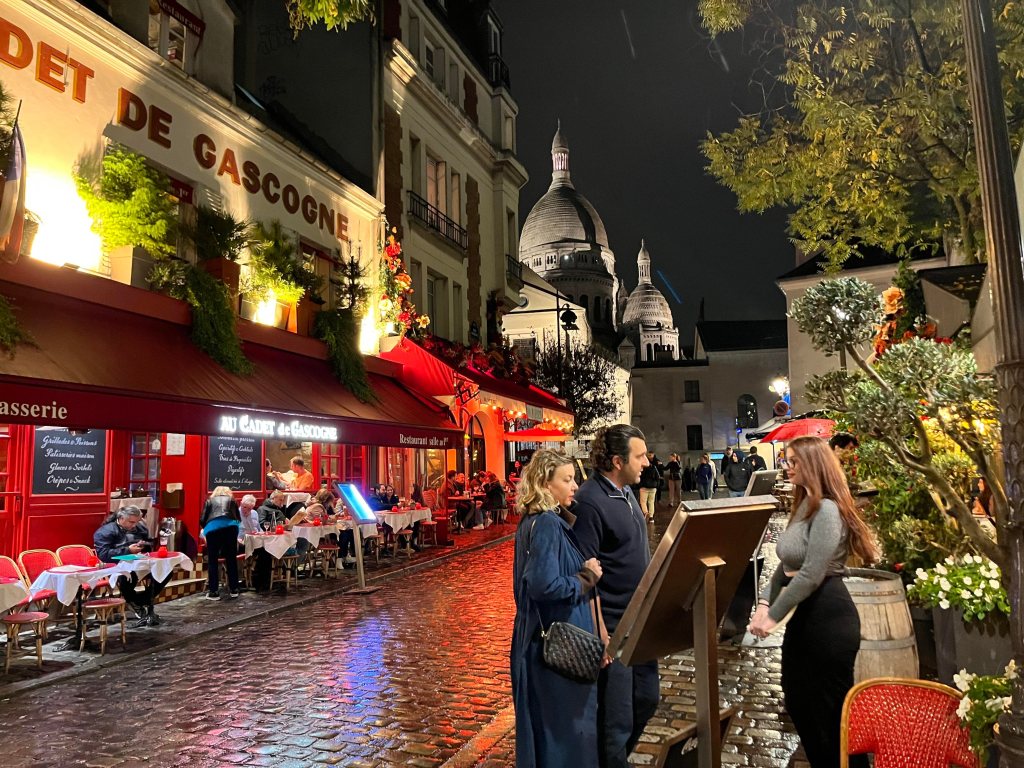 Vi hann hem en liten stund innan det var dags för dagens tredje utflykt – En glad kväll i Montmartre. Kl 18.00 åkte vi upp till Montmartre där vi började med att gå uppåt mot Sacré-Coeur. En del gick hela vägen upp men många av oss åkte med Le Funiculaire som är en bergbana. Väl uppe på Montmartrekullen har man en fantastisk vy ut över Paris. Vi gick in i Sacré-Coeur en liten stund innan vi gick vidare upp till Place du Tertre. Det är ett torg där Paris målare sitter och målar och gör porträtt av människor som önskar det. Jag älskar denna plats. Det är så mysigt och det är fullt av butiker, restauranger och caféer.