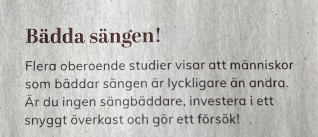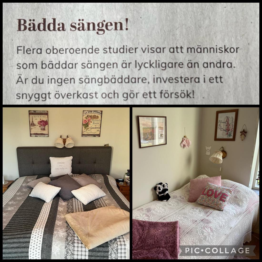 Ser man på, ser man på!? Genom att bädda sängen varje morgon kan man känna sig lyckligare. Jag läste detta i ”Vi i villa” idag. Själv bäddar jag sängen en stund efter att jag stigit upp. Jag vill vädra ur kvalstren först. Frågan är om de försvinner. Jag tror detta påstående stämmer på mig. Jag tycker det är trevligare att vistas i ett rum om sängen är bäddad. Inte kul att se en obäddad säng hela dagen.