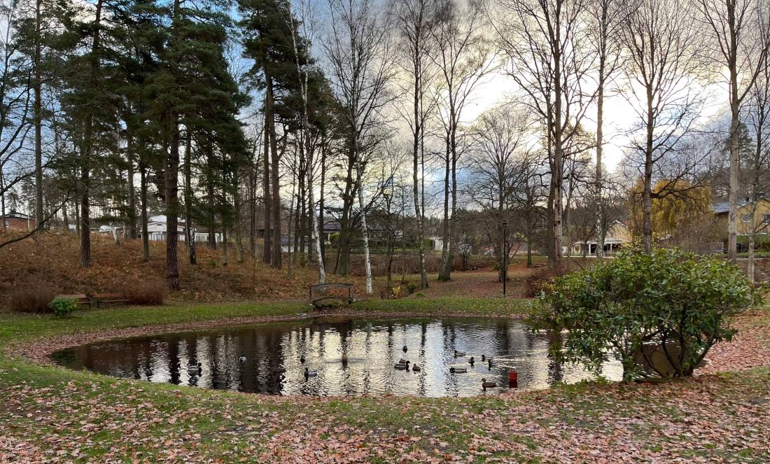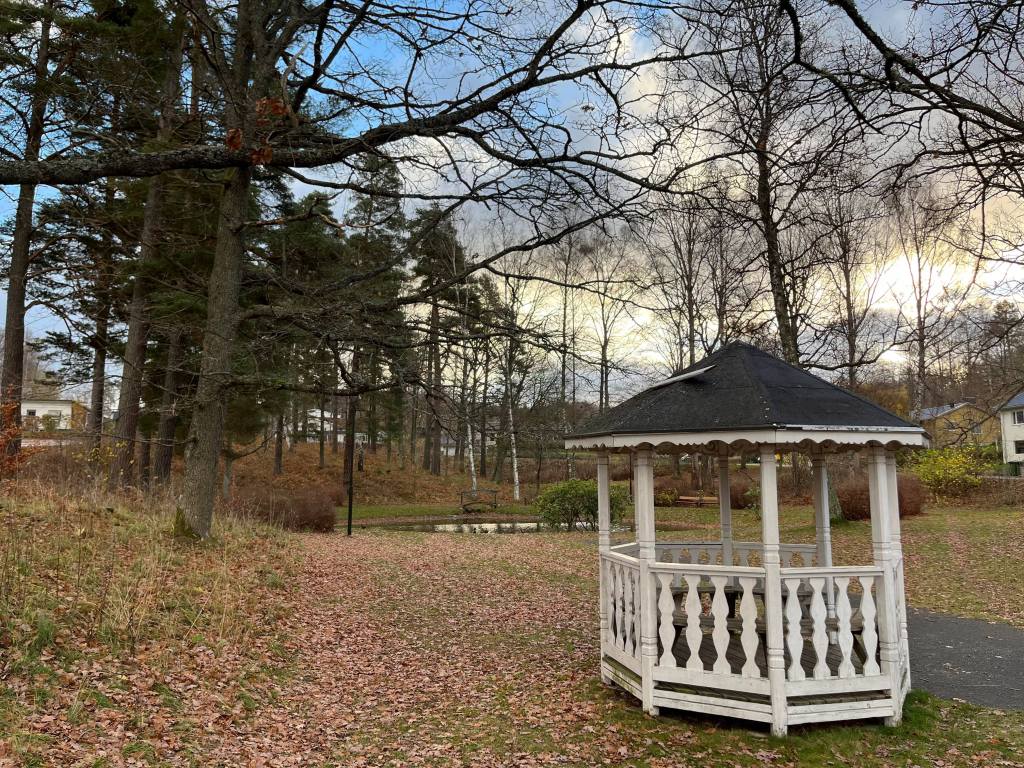 Jag följde min vän Annelie ner till bussen idag på morgonen. Det var ett härligt väder och på vägen hem stannade jag till vid Flugebogölen och tog några foton. Jag njuter av att gå och strosa och insupa allt naturen ger. Här finns också ett litet lusthus.