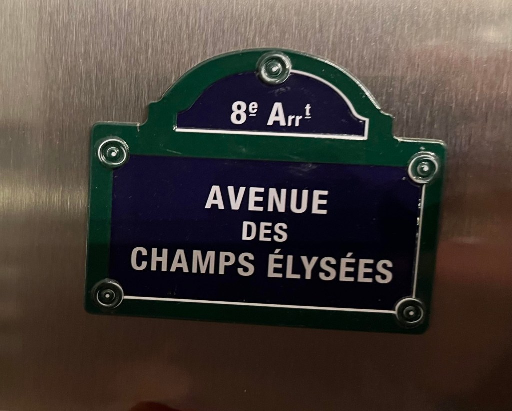 På mitt kylskåp har jag bl a dessa två skyltar från Paris. Jag tycker att gatuskyltarna är ljuvliga. På skylten står det också vilket av Paris 20 arrondissement området tillhör. När man ser skylten ovan är man således i det sjunde arrondissementet. Är man på Champs-Élysées befinner man sig i det åttonde arrondissementet. Det 8e Arr heter l’Élysée. Champs-Élysées är en 2 km lång paradgata i Paris som sträcker sig från Place de la Concorde till Triumfbågen som ligger på Place Charles de Gaulle (tidigare Place de l’Étoile) ibland även kallad Place Charles de Gaulle Étoile.