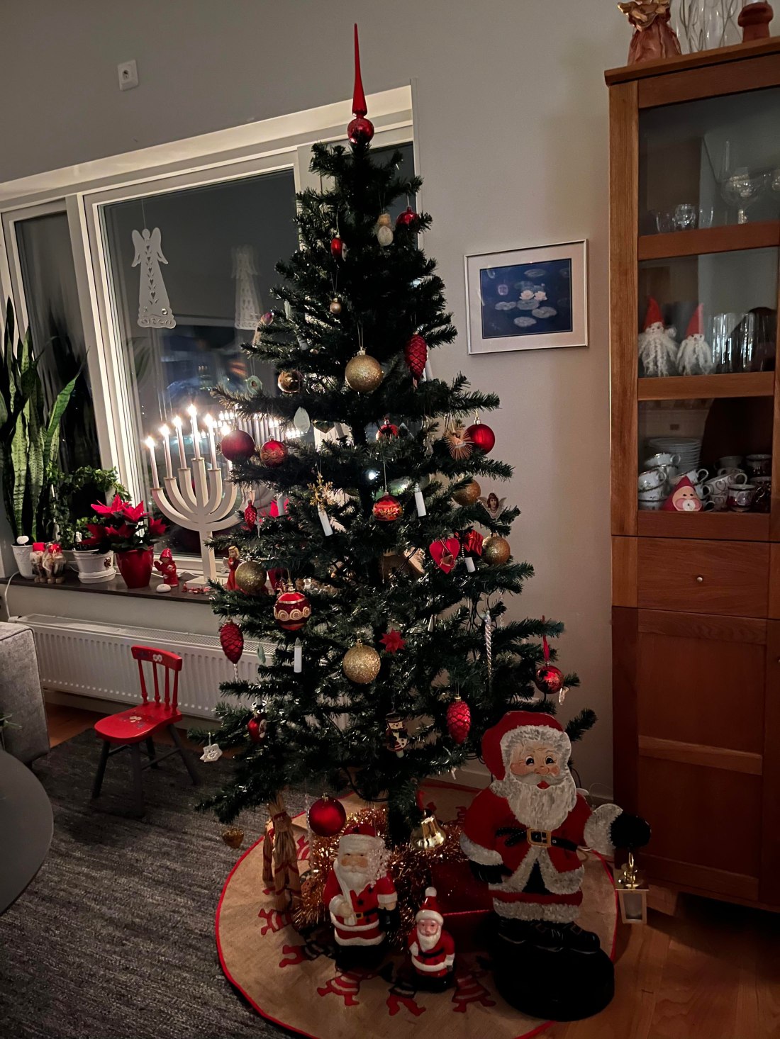 Ikväll har jag klätt den gran som mamma en gång hade. När hon flyttat till himlen fick jag ta med den hit. Förr hade jag kanske inte trott att jag skulle ha en plastgran men om jag säger konstgran låter det bättre. Jag var hemma hos mamma mycket och såg denna gran. Speciellt de sista åren då hon var sjuk satt jag ofta intill granen när jag arbetade på dagarna. Jag har lärt mig tycka om den och är nu riktigt glad att jag har den här hos mig. Det är också praktiskt för den behöver inget vatten. Jag kommer att vara hemma i jul men om jag skulle åka bort några dagar skulle en levande gran inte klara sig så detta är jättebra. Jag fick några av mammas tomtar som står så fina framför granen.