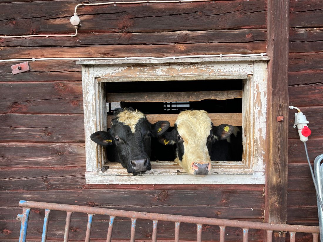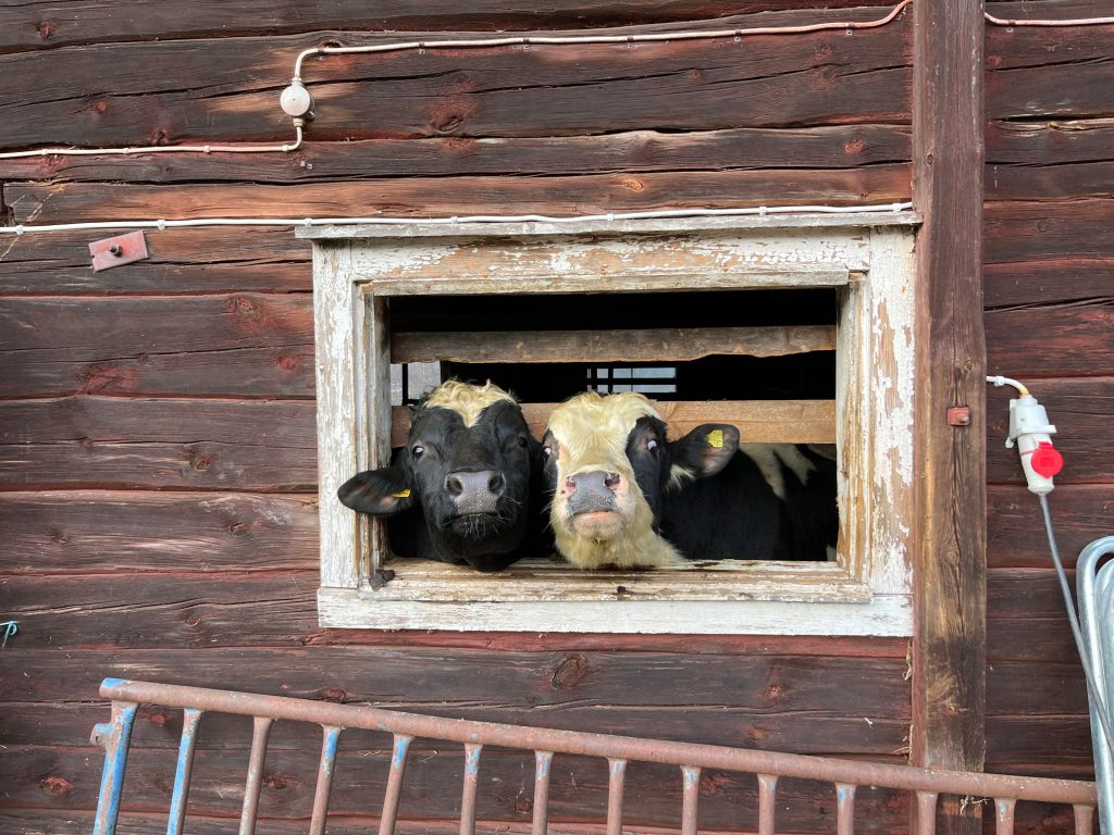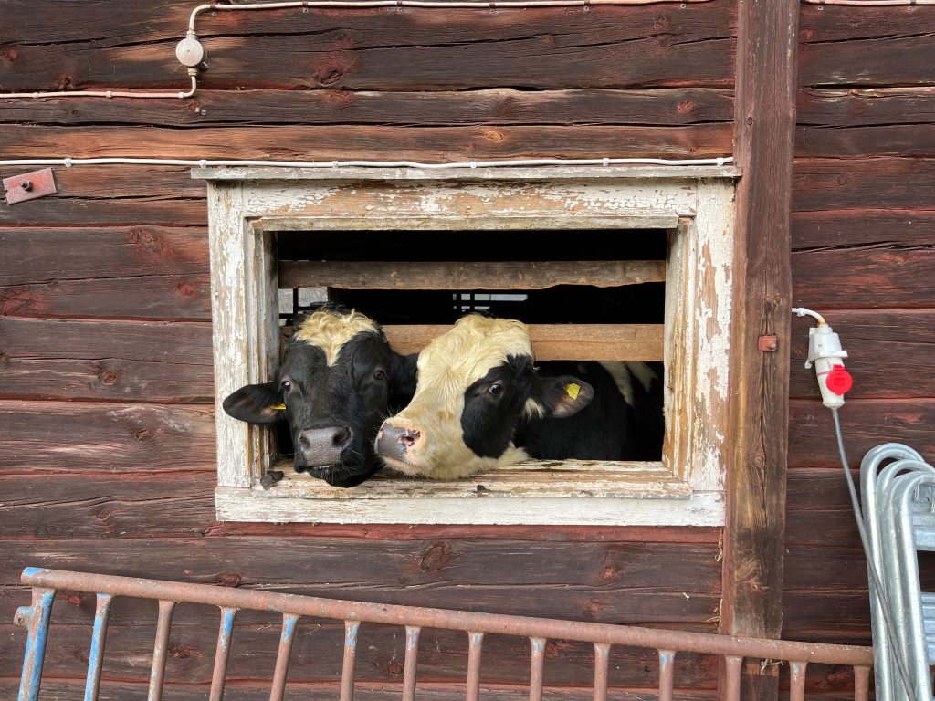 När vi kom ut till vägen där det finns en bondgård fascinerades vi av de söta kossorna som stod och tittade ut genom fönstret. Så klart att de också vill veta vad som sker ute i vida världen.