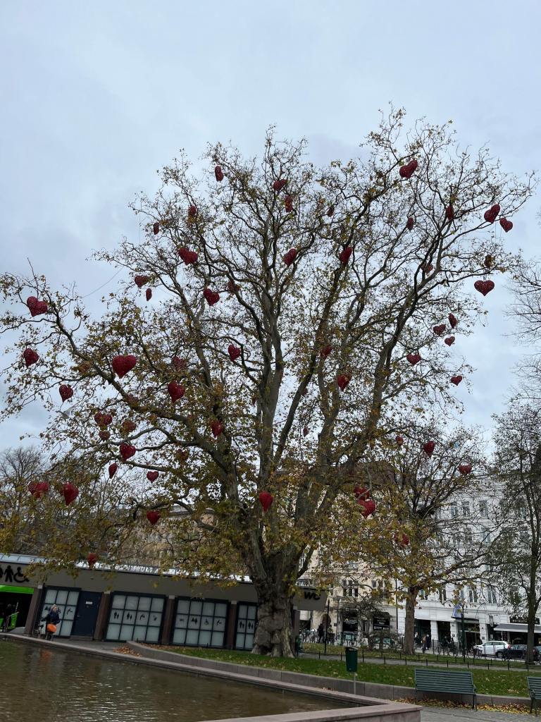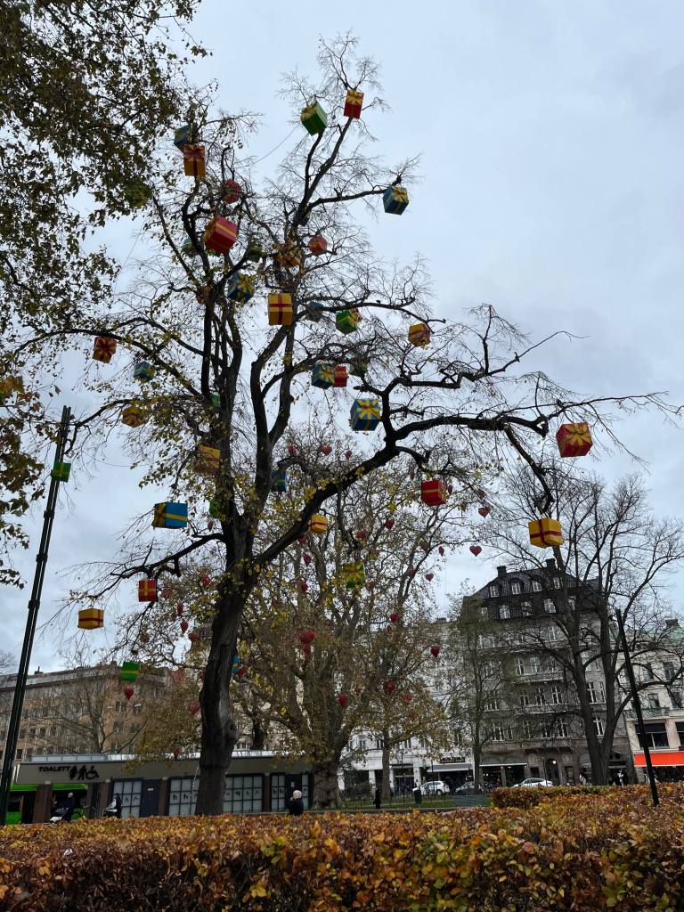 Vid Gustav Adolfs Torg fanns träd prydda med paket och med hjärtan. Mysigt!