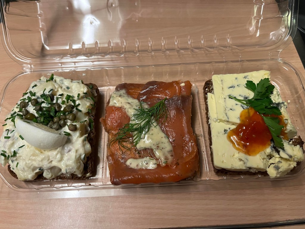 Sen var det dags att gå till centralstationen. Jag var på ett ställe som säljer smörrebröd. Jag fick se att de hade färdiga förpackningar med gårdagens smörrebröd så jag köpte dessa tre smaskiga smörrebröd för endast 60 kr totalt. Det tycker jag var billigt. Så fort jag hoppat på tåget börja jag inmundiga dessa läckerbitar. Jag smällde i mig alla tre och det fick bli en försenad lunch. Mums, vad det var gott och jag förblev mätt resten av dagen.