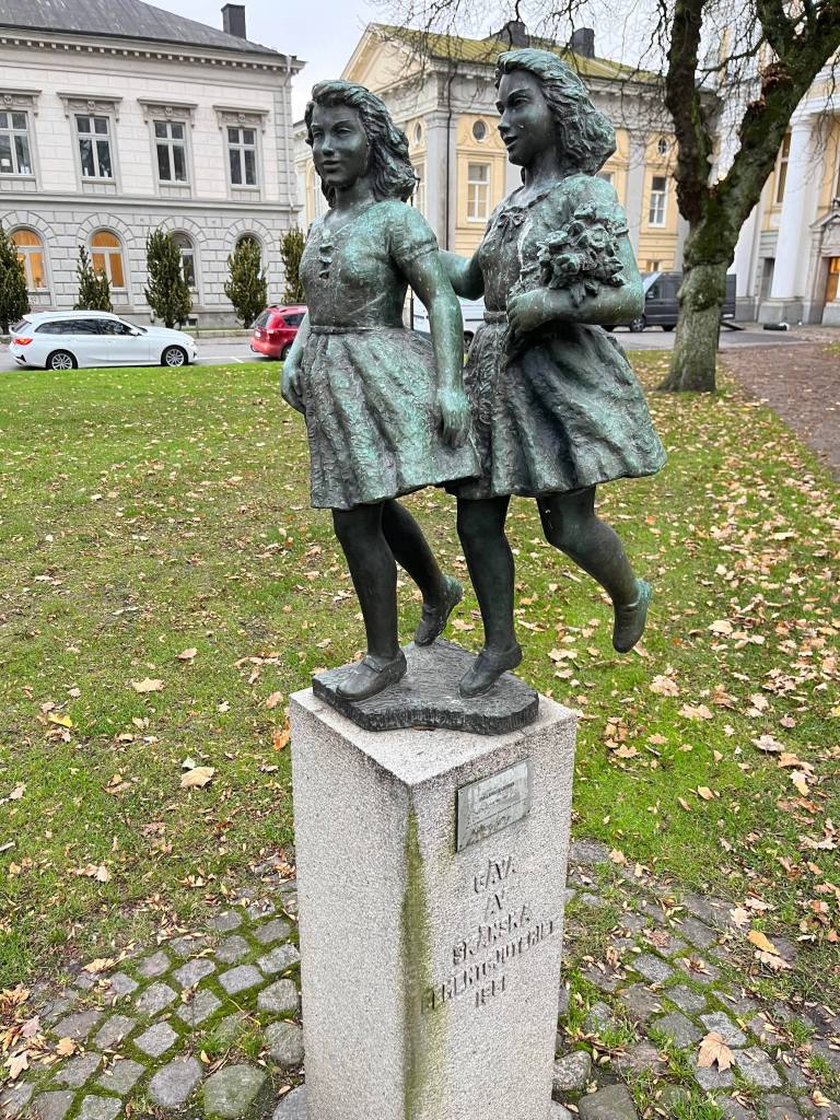 Det är alltid trevligt att möta dessa glada smålandsflickor. De är placerade utanför Per Brahegymnasiet i Braheparken. Bronsskulpturen är skapad av Torwald Alef, en konstnär som levde 1896-1974. Han är född i Jönköping. Denna typ av konst gillar jag mycket.