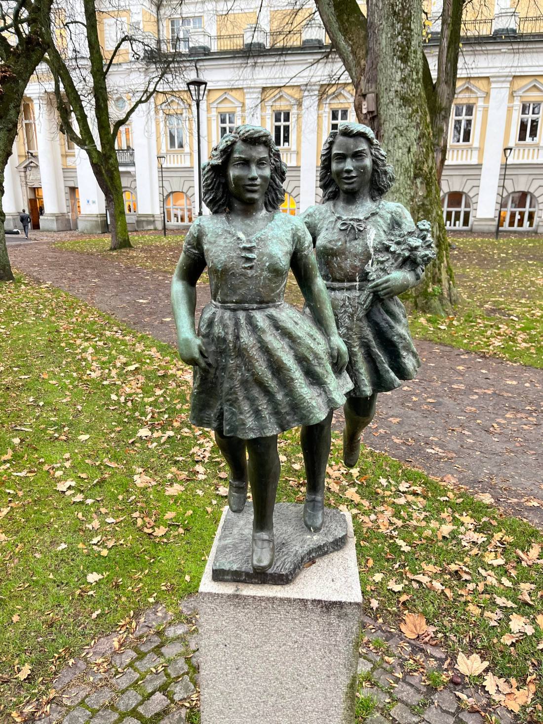 Det är alltid trevligt att möta dessa glada smålandsflickor. De är placerade utanför Per Brahegymnasiet i Braheparken. Bronsskulpturen är skapad av Torwald Alef, en konstnär som levde 1896-1974. Han är född i Jönköping. Denna typ av konst gillar jag mycket.
