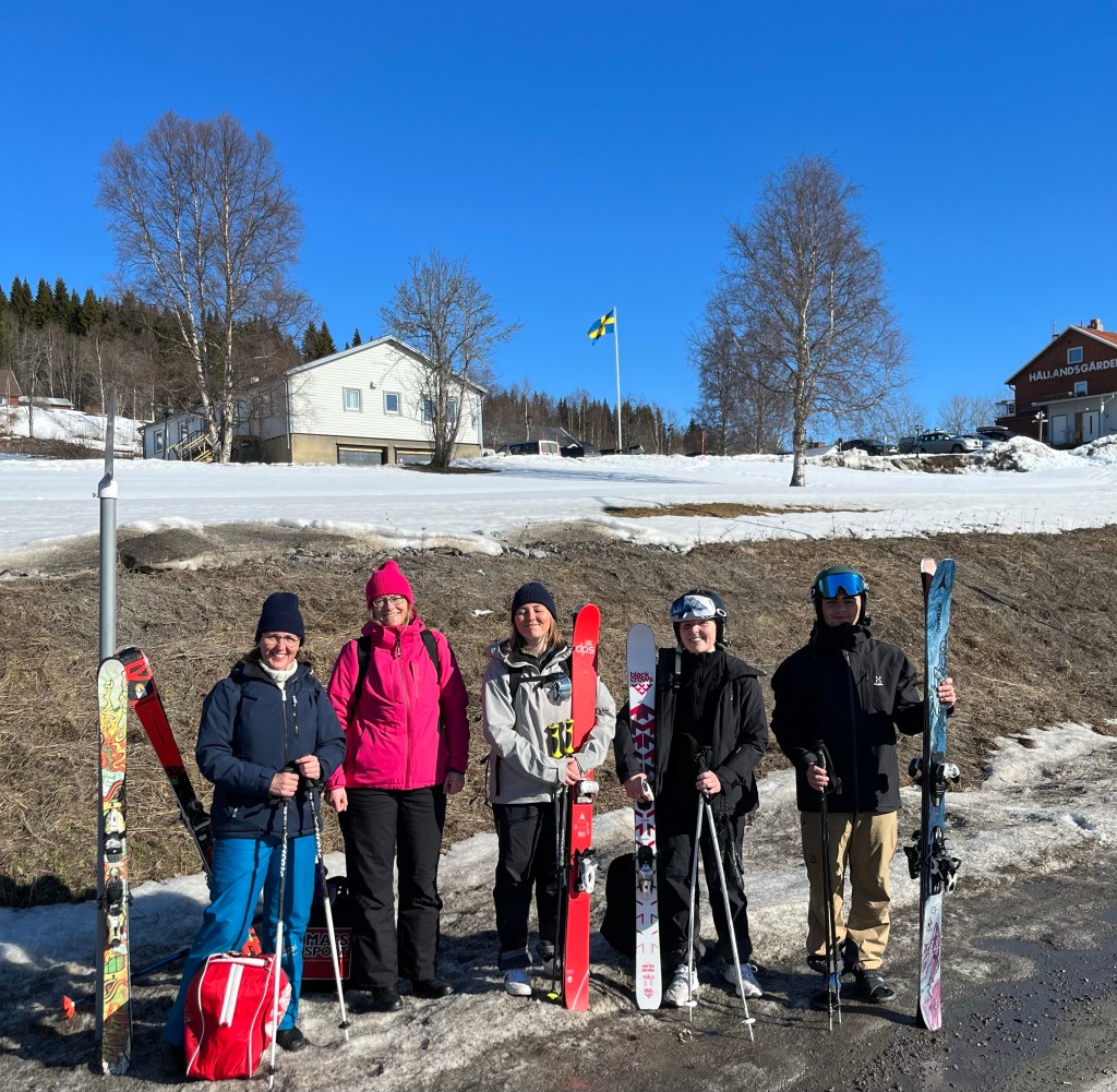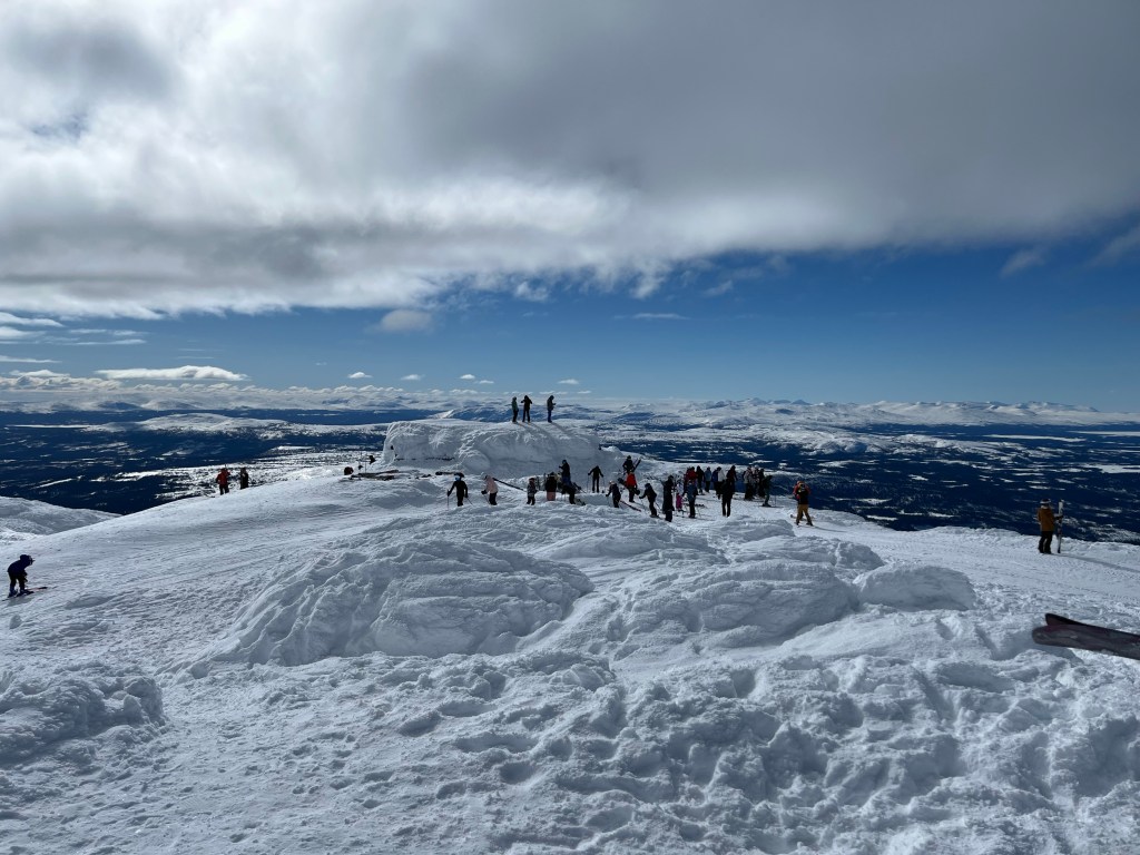 Vi tog oss med liftarna upp så långt vi kunde men för att nå toppen av skutan måste man gå eller tolka efter skoter. Ungdomarna valde att gå men Susanna och jag tolkade efter skoter. Det var jobbigare än jag hade anat. Det var ett tjockt rep med öglor där man fick stoppa in sina stavar och sen hålla i dem på vägen upp. Vi var ca 7-8 personer som tolkade samtidigt. Ibland gick det nedför och då gällde det att bromsa lite grand så man inte åkte in i framförvarande person. Ibland gick det brant uppför och då gäller det verkligen att hålla i sig. Skoterföraren körde riktigt fort, puh! Jag kan säga att jag var glad när vi äntligen var uppe på toppen.