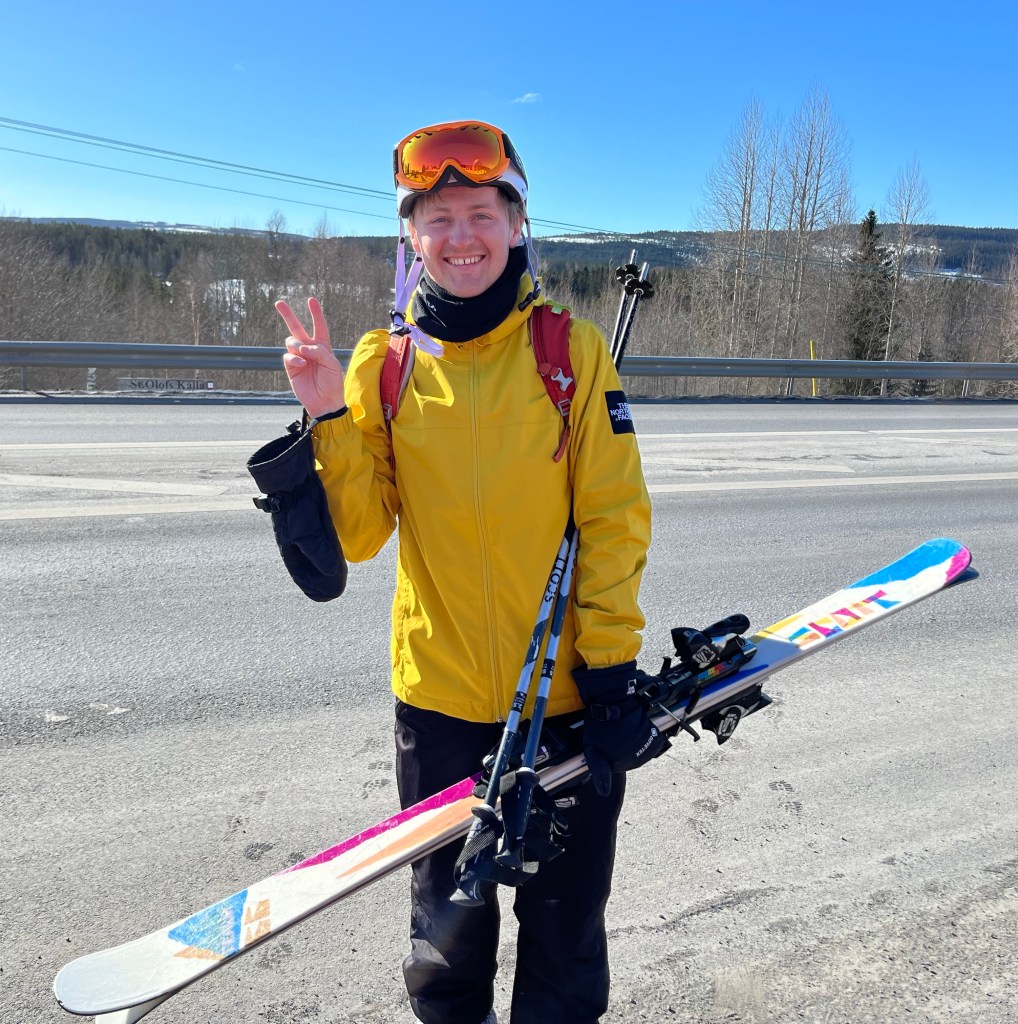 Vissa dagar kunde vi låna bil av Annies kompisar och köra till Åre. Andra dagar tog vi bussen. Här väntar vi på bussen precis utanför Hållandsgården.