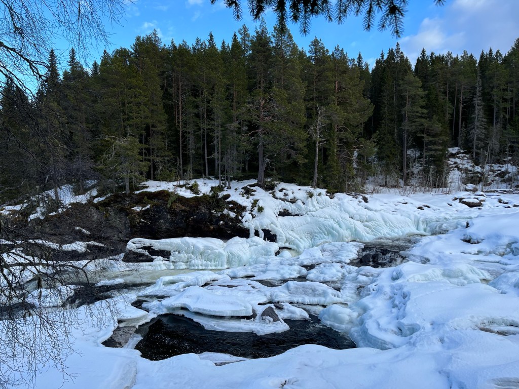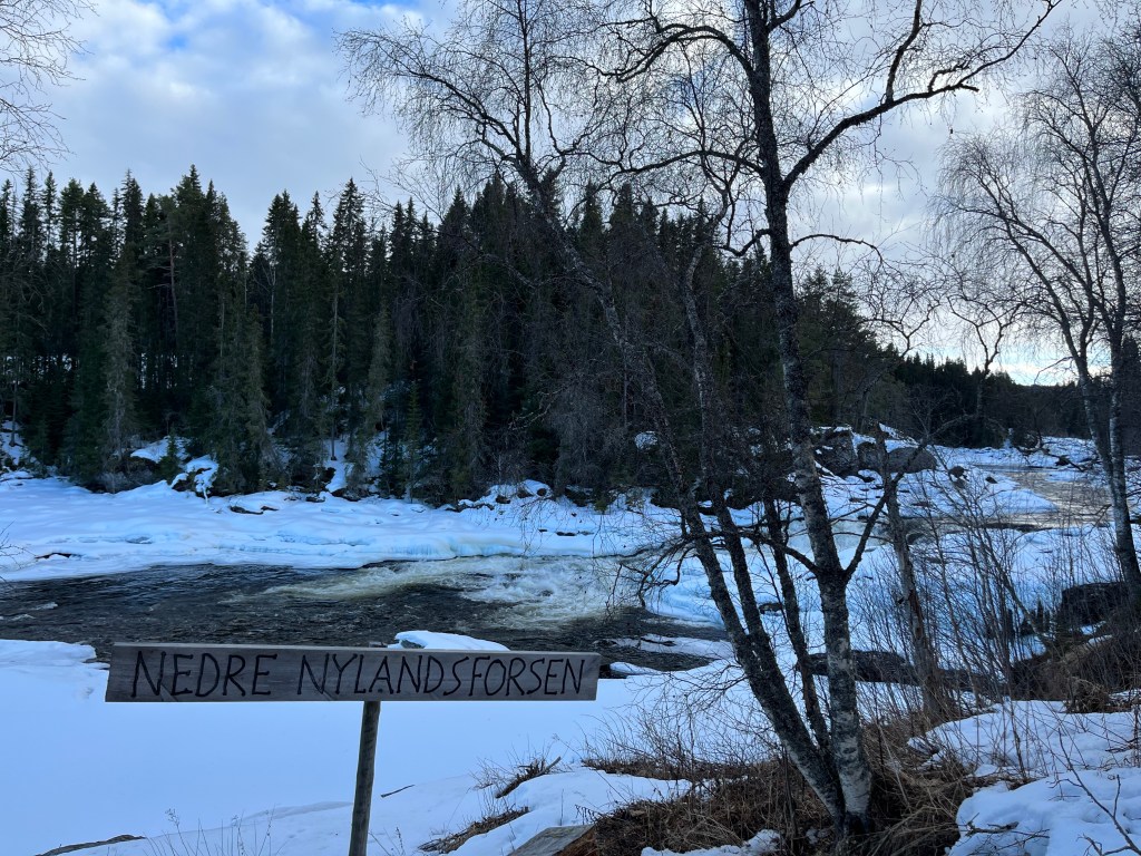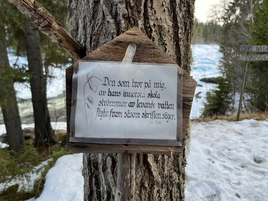Idag var det inte mycket vatten som forsade för det var fruset men om några månader kommer vattnet att forsa för fullt. Så fint bibelord som är uppsatt på ett träd! Den som tror på mig, ur hans innersta skall strömmar av levande vatten flyta fram, som Skriften säger. Tänk att strömmar av levande vatten kan få flyta fram inom oss genom tron på Jesus Kristus. Det är jag tacksam för. Jag ber att gammalt unket vatten som finns i mig ska åka bort när det levande fräscha vattnet strömmar in. Det är viktigt att leva nära den levande källan där vattnet flödar. Jag ber att jag ska få leva i förnyelse med Jesus varje dag och att det som inte är bra inom mig ska sköljas bort när det levande vattnet flödar genom mig.