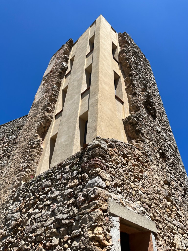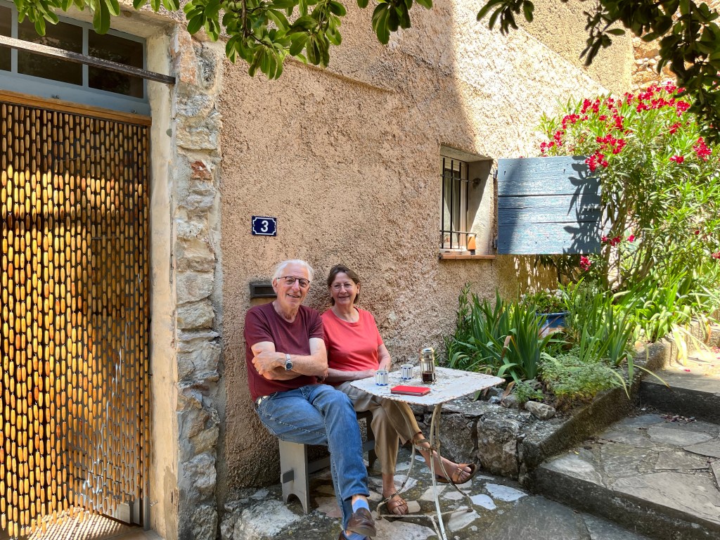Strax nedanför satt detta trevliga par så vi stannade och frågade om de visste om man kunde få gå upp i tornet. Det visade sig att mannen i huset hade köpt fastigheten med tornet för ett antal år sen och renoverat det. Han erbjöd sig att visa det för oss även om det är helt privat alltså. Gissa om vi blev glada!