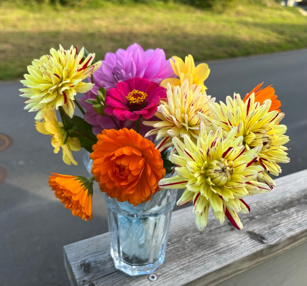 Jag är glad att jag kan plocka blommor i min egen trädgård. Jag hade med denna lilla bukett till InaSiv. Olika färger i en salig blandning. Färger gör mig glad.