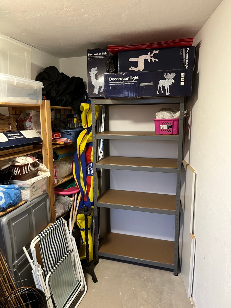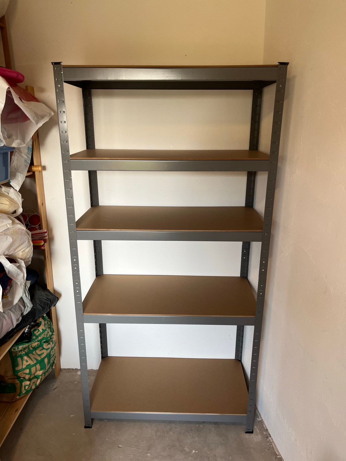 Jag har längtat efter att få upp denna hylla som jag köpte för ett eller två år sen. Jag vill ha bättre ordning i uteförrådet. Idag var det dags och jag var verkligen på G. Jag röjde i förrådet och beredde plats för hyllan. Även om jag redan har gått igenom mycket av mitt material sen lärartiden så finns det ett antal lådor kvar. Nu ska jag gå igenom allt. Jag får ta en låda i taget. Det som är värt att spara ska inte ligga i lådor. Det ska stå på hyllor så jag har nära till det.