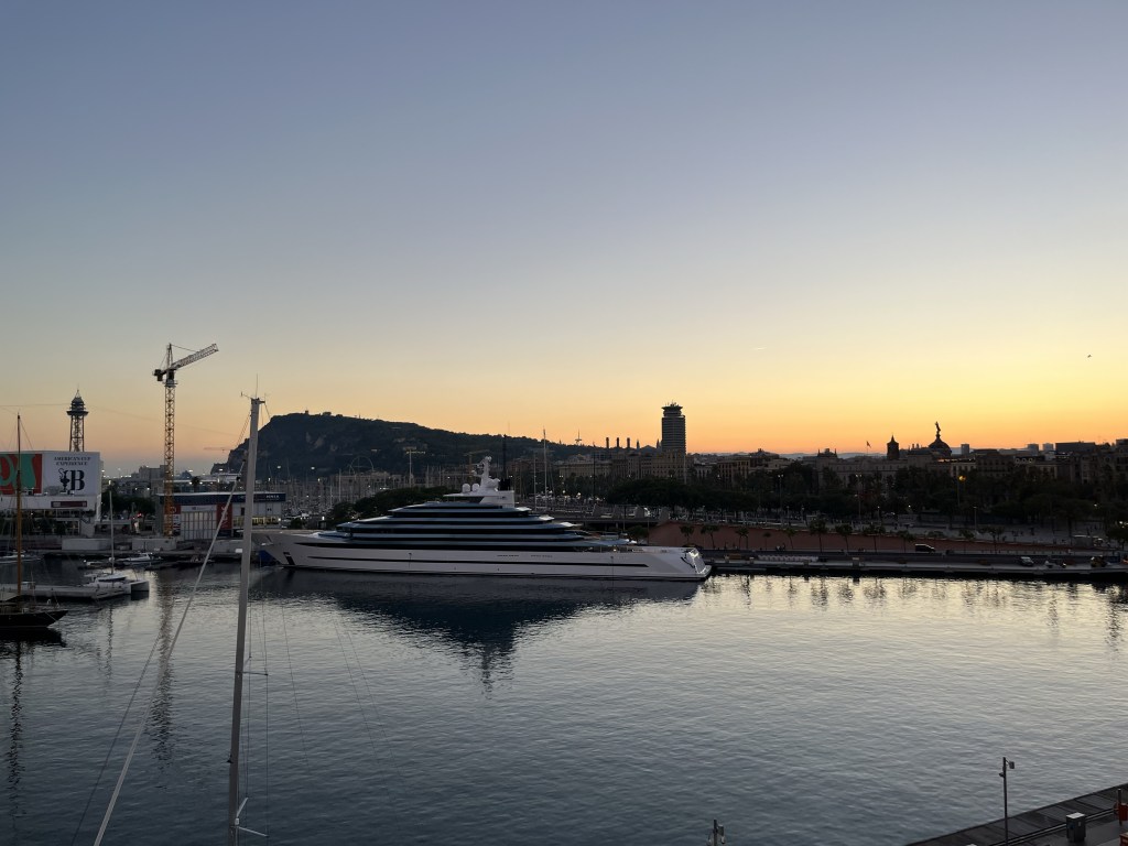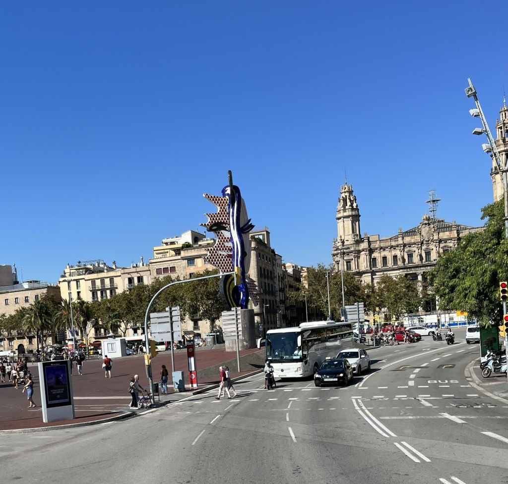 Här ser vi återigen vackra hus och vi närmar oss en staty över Christopher Columbus. Den ligger på Plaza del Portal de la Pau och invigdes den 1 juni 1888 inför Världsutställningen i Barcelona. Statyn är 60 meter hög. Den föreställer Columbus med utsträckt högerarm och pekfingret som pekar mot havet. Inledningsvis folk sa att han pekar mot Amerika men det är fel eftersom Amerika ligger åt andra hållet…om man inte tänker på att jorden är rund förstås. I så fall är ju båda riktningarna rätt men det är närmast åt det andra hållet.