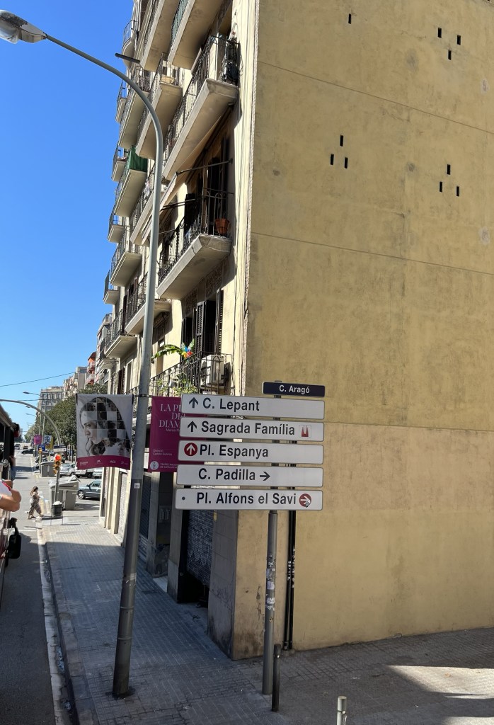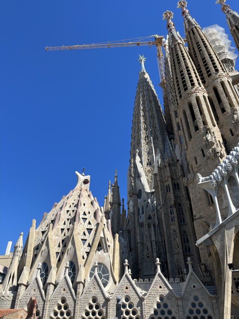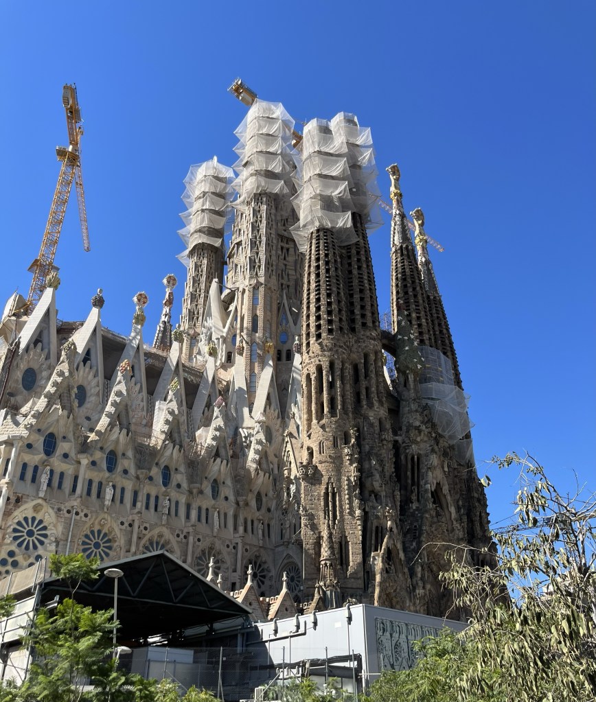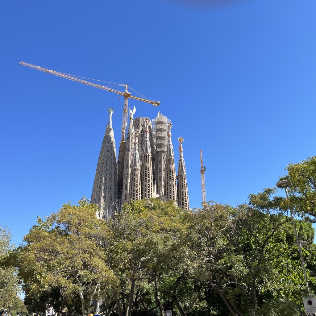 Nu närmar vi oss Sagrada Familia, en basilika som ännu inte är färdigbyggd. Den började byggas 1882 och det är Antoni Gaudi som är hjärnan bakom denna skapelse. När han dog 1926 var kyrkan bara färdig till en del. Sedan dess har arbetet fortlöpt och många arkitekter och skulptörer har satt sin prägel på Gaudis vision. Projektet finansieras nu av de mer än en miljon besökare som varje år kommer för att besöka kyrkan. Man beräknar att kyrkan ska vara färdig år 2026, vid hundraårsfirandet av Gaudis död.