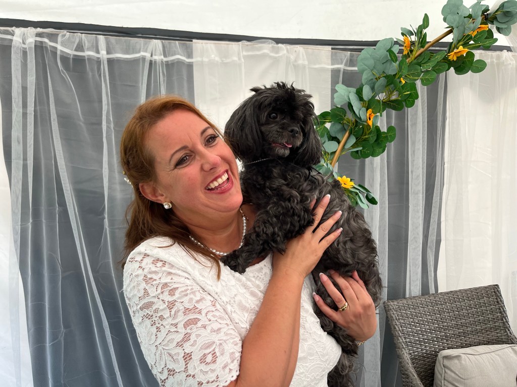 Sen blev det fest hemma i Hans och Anitas trädgård. De hade satt upp ett partytält. Lilla hunden och älsklingen Vira var också med på bröllopsfesten.