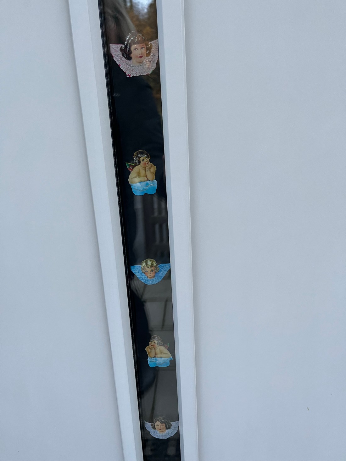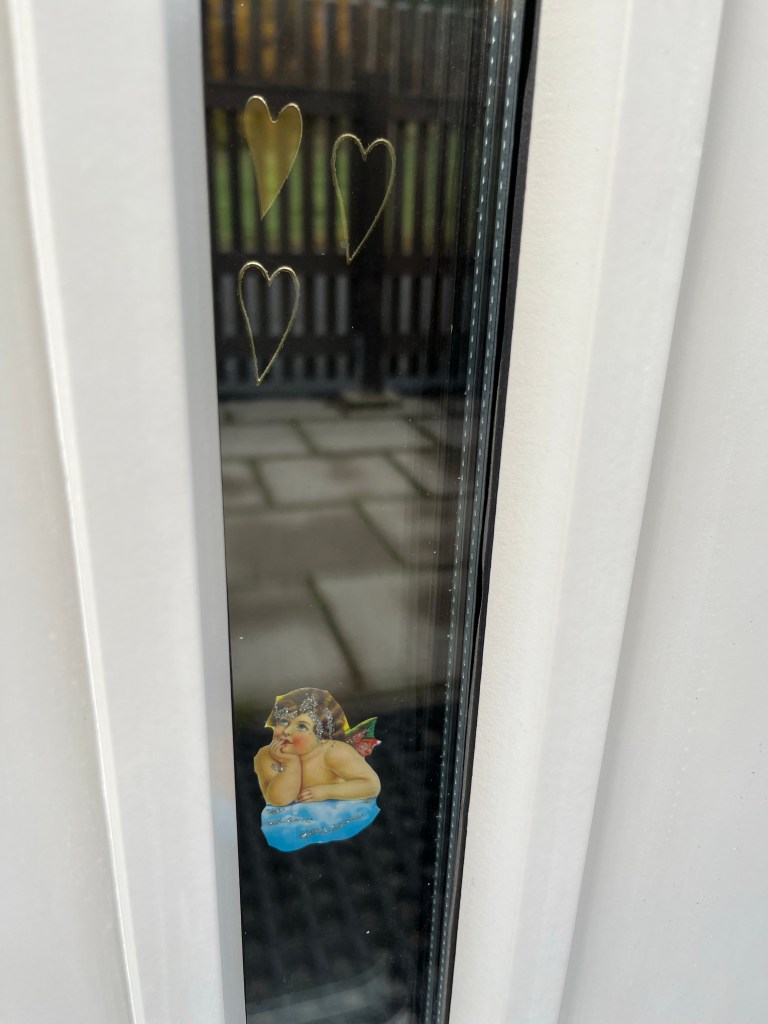Jag gjorde en lång svart remsa som jag klistrade änglar på. Så tejpade jag fast den framför fönstret. Jag tycker det blev gulligt. Nu kan ingen se in. Toppen!