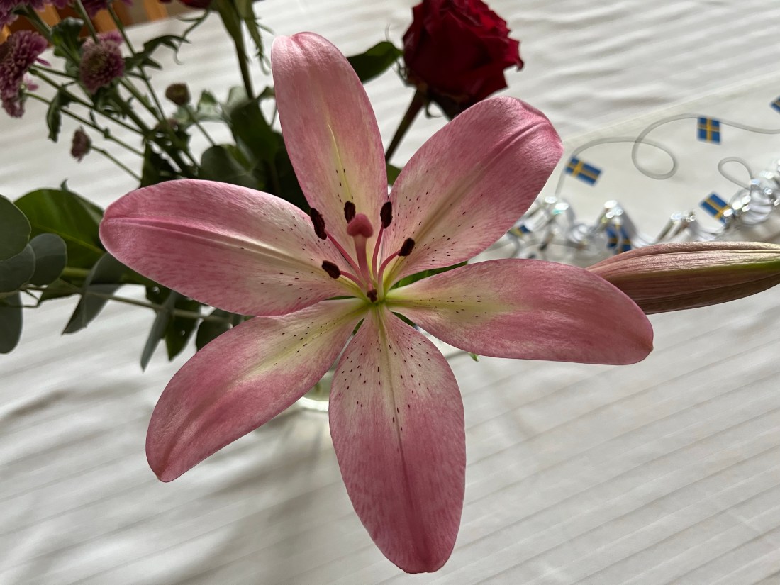Jag fascineras av denna rosa lilja. Den är vacker. Jag har dock tagit till vana att klippa av ståndarna efter ett tag eftersom det finns risk att frömjölet faller ner och missfärgar duken och annat det kommer i kontakt med. Jag har läst att blommorna står längre utan ståndare så det är en bra idé att ta bort dem. Visserligen är liljorna finare som de är men jag tänker praktiskt. Jag passade på att fotografera innan ingreppet.