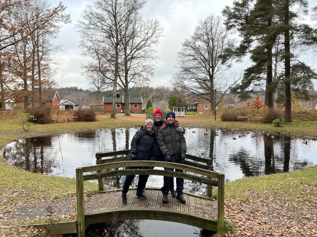 Nathalie, Erik och lille Kasper dök upp till vår sena frukost. De hade åkt tidigt från Nyköping. Efter frukost tog vi en skön promenad i omgivningen. Vi gick upp på Hovslätts Ängar där det byggs för fullt just nu och så tog vi en runda i skogen och i samhället. Här ser vi Anita, Hans och Erik vid Flugebogölen.