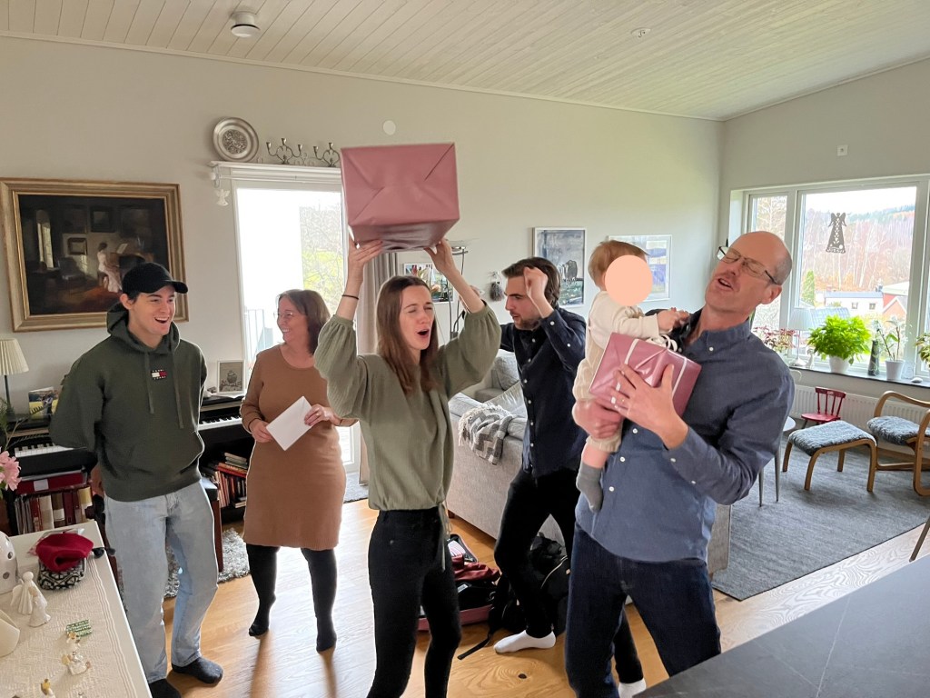 När vi kom hem igen blev det uppvaktning. Här var det livat, här var det glatt. De sjöng och dansade och uppvaktade med kort och presenter.