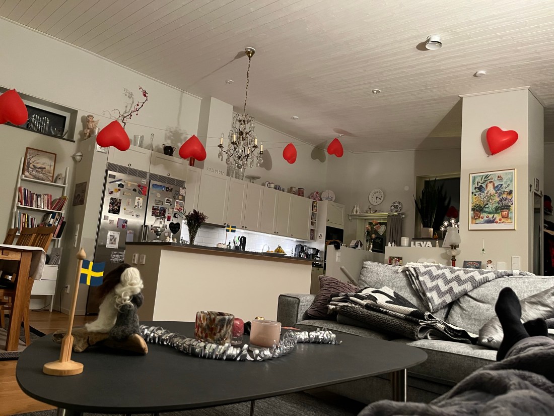 Jag tänker leva i 60-årsfirarglädjen en vecka till och ha kvar de röda hjärtballongerna. Den vita duken och dekorationerna får också ligga kvar. Så har jag fortfarande en del fina blommor. Det är underbart. Till helgen kommer några goda vänner från Nybro hit. De ska bjuda mig på lunch på stan och sen följa med hem.