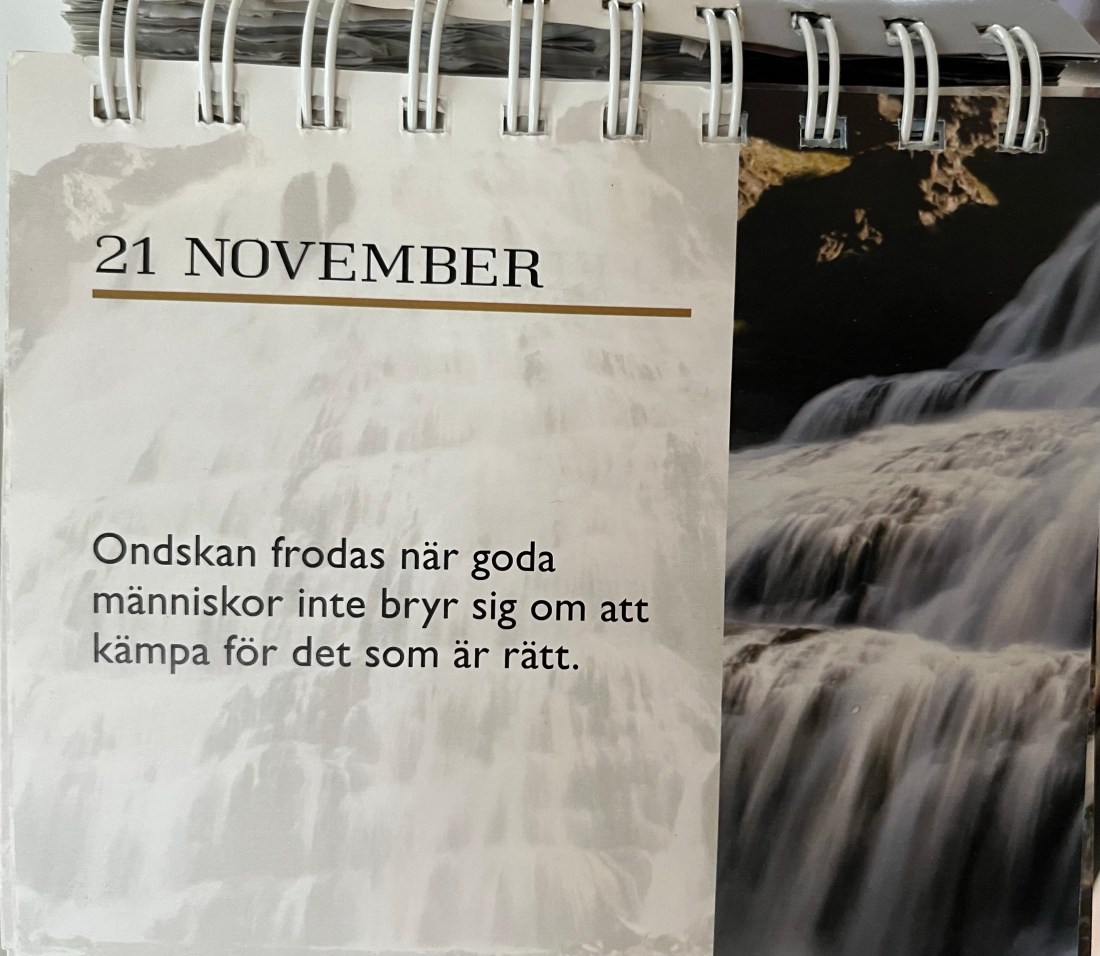 Detta är dagens budskap i min kalender Tankar om Livet 2. Det är högaktuellt. Det händer mycket i Sverige och världen som vi bara häpnar över. Det är lätt att bara tänka på det, prata med andra om det men sen inte agera. Jag tror att vi MÅSTE agera nu för att stoppa det som går i fel riktning. Jag vill uppmana alla att skriva insändare, ringa eller maila TV, radio och tidningar. Vi kan inte tillåta vad som helst. Ser du någon bra artikel kan du också dela den på sociala medier och be att fler delar den så att budskapet sprids.