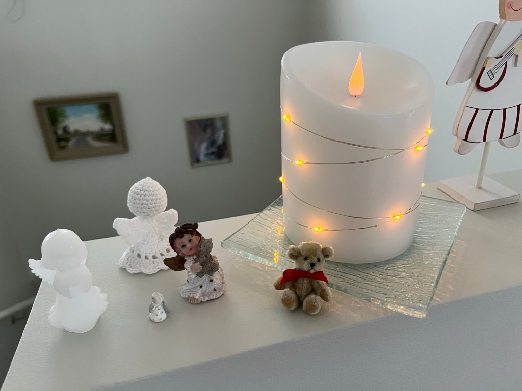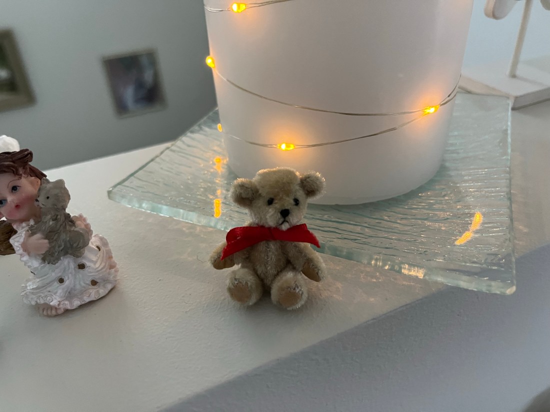 Titta så söt liten nalle jag fick när jag fyllde 60! Den är specialbeställd till mig. Nu har jag hittat en bra plats där han kan få bo. Jag tror han kommer att trivas fint här bland änglarna. Det är roligt med presenter. Varje gång jag ser honom tänker jag på mina gulliga vänner som jag fick honom av och ibland sänder jag upp en bön för dem.