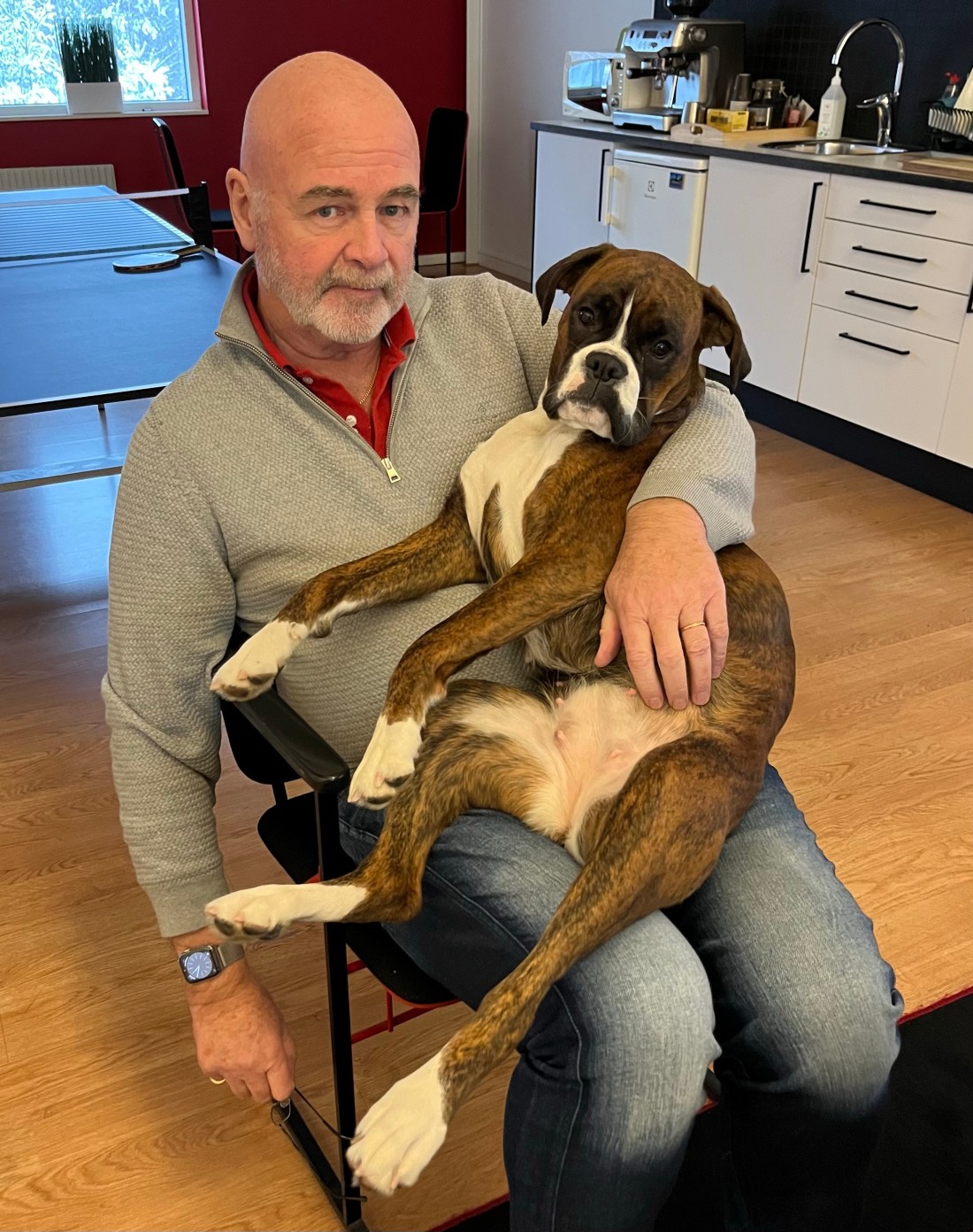 Idag har jag varit på kundbesök hos Janne och gänget. Vi skulle titta på kampanjrapporter för den annonsering företaget haft under 2023 och utvärdera året. Förutom VD Janne, ekonomichef och platschef var även hunden Selma med. Oh, vilken ljuvlig vovve! Det går inte att ta miste på den kärlek som råder mellan människor och djur på detta företag. Rätt som det är tar Janne upp Selma i knäet och börjar gosa med henne. Så mycket kärlek! Så visar han mig en film från gårdagen då hon fyllde ett år. Janne sjöng en vacker födelsedagssång och serverade henne ett stort lass med leverpastej och en massa annat gott. Så underbart!