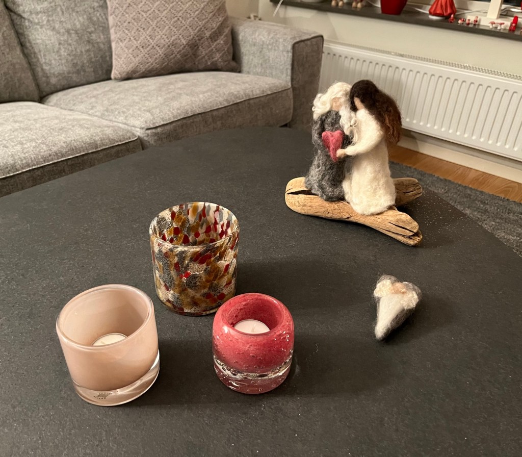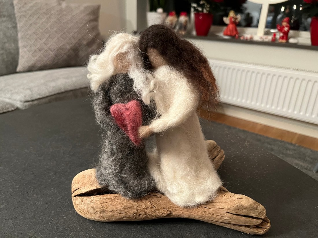 Jag fick denna underbara ”skulptur” av min goda vän Bodil när jag fyllde år. Den ska symbolisera omsorgen som finns mellan oss systrar i vänskapsfamiljen. Jag är systern till höger. Jag tycker skulpturen är ljuvlig och blev jätteglad för den. Omsorgen oss människor emellan är livsviktig. Skulpturen är skapad av Ulrika Sjöberg.