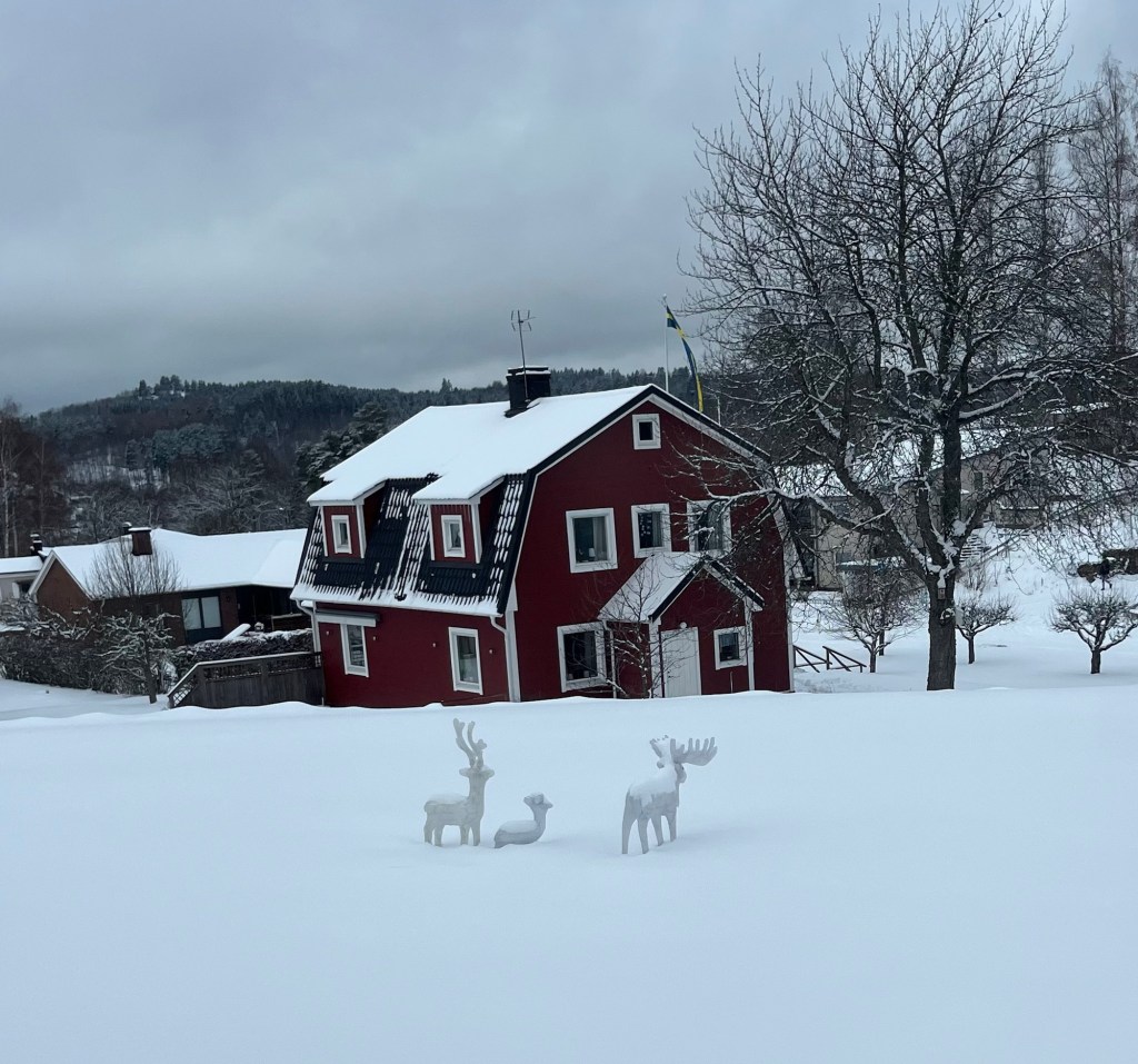 När jag tittar ut här nere så har min lilla hjortkalv snö ända upp till magen. Jag brukar gå ut och borsta av snön och platta till snön lite hos djuren men det har jag inte gjort efter att den senaste snön kom. En del säger att jag har fina renar i trädgården men det är inga renar. Det är en älg, en hjort och en kalv. Jag gillar dem.