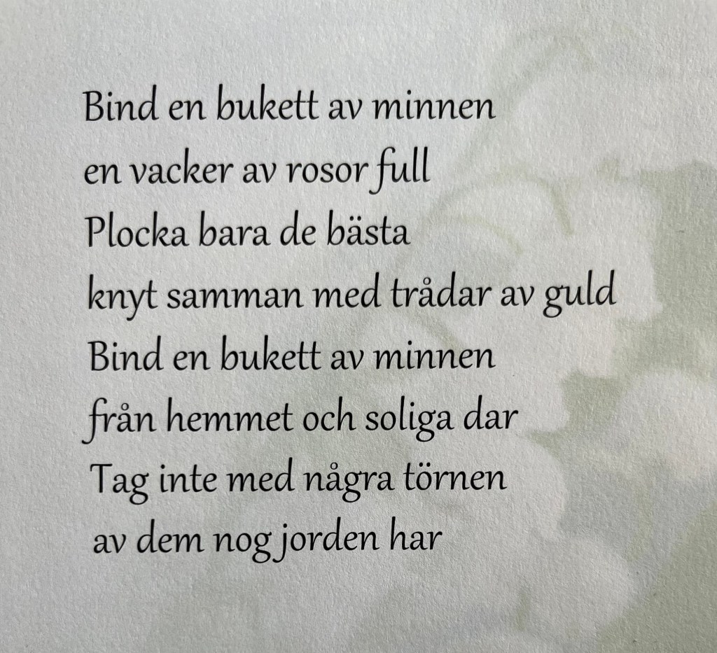 Bind en bukett av minnen, en vacker av rosor full. Plocka bara de bästa, knyt samman med trådar av guld. Bind en bukett av minnen från hemmet och soliga dar. Tag inte med några törnen, av dem nog jorden har.