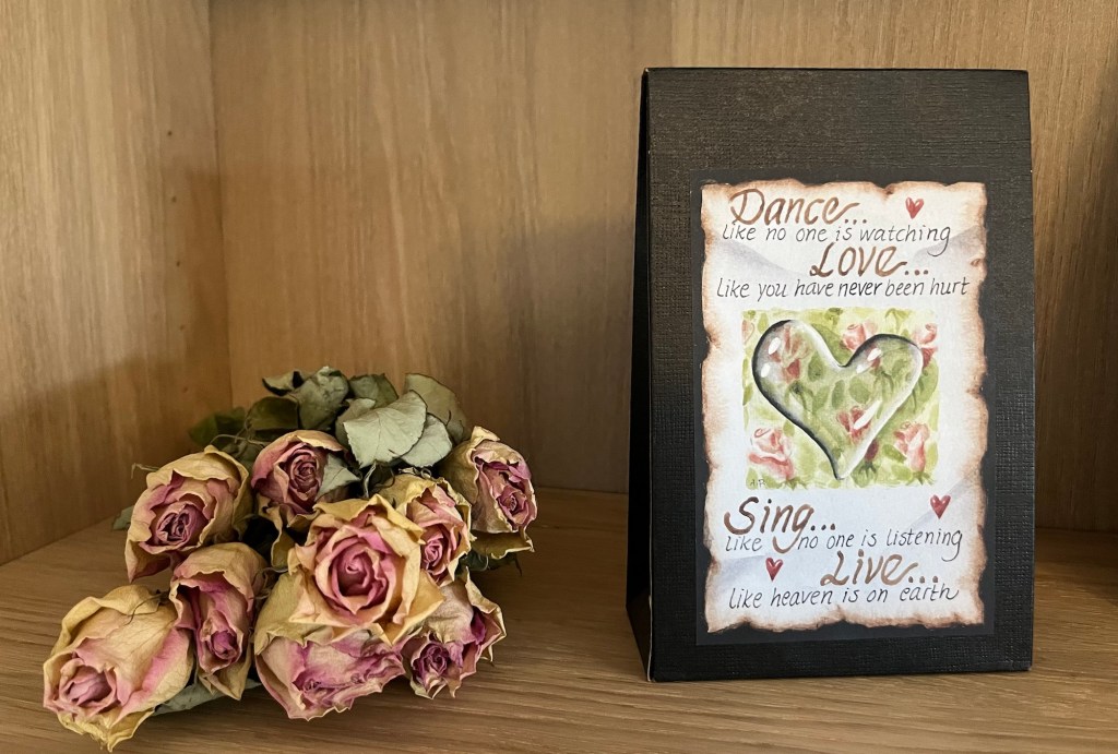 Jag delar några detaljer från min bokhylla idag. Till vänster ligger en bukett torkade rosa rosor. Till höger står en förpackning/kartong som jag tror att jag fick kolor eller annat i en gång. Jag tycker budskapet är bra.