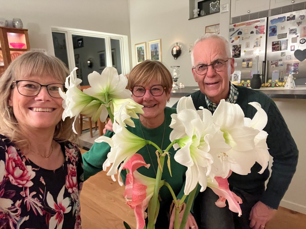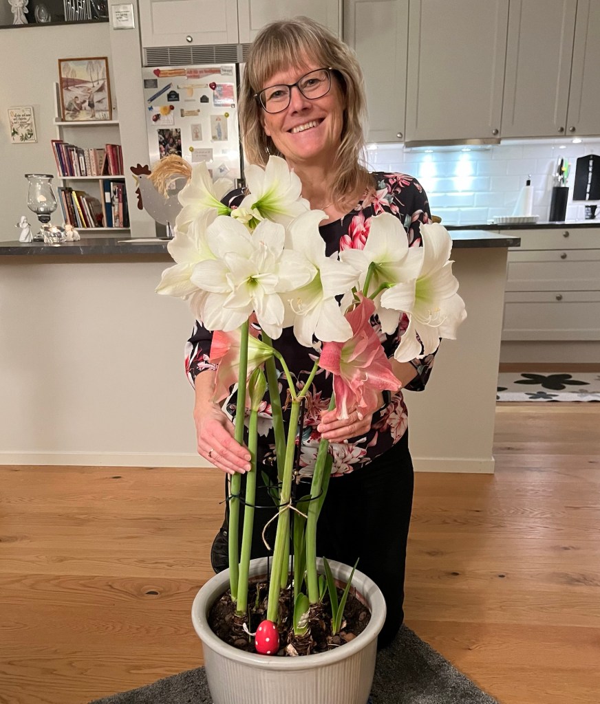 Vi har haft en jättetrevlig kväll med mat, fika och prat. Vi har mycket gemensamt och alltid mycket att prata om. Det blev en selfie bland amaryllisarna. ![]()
