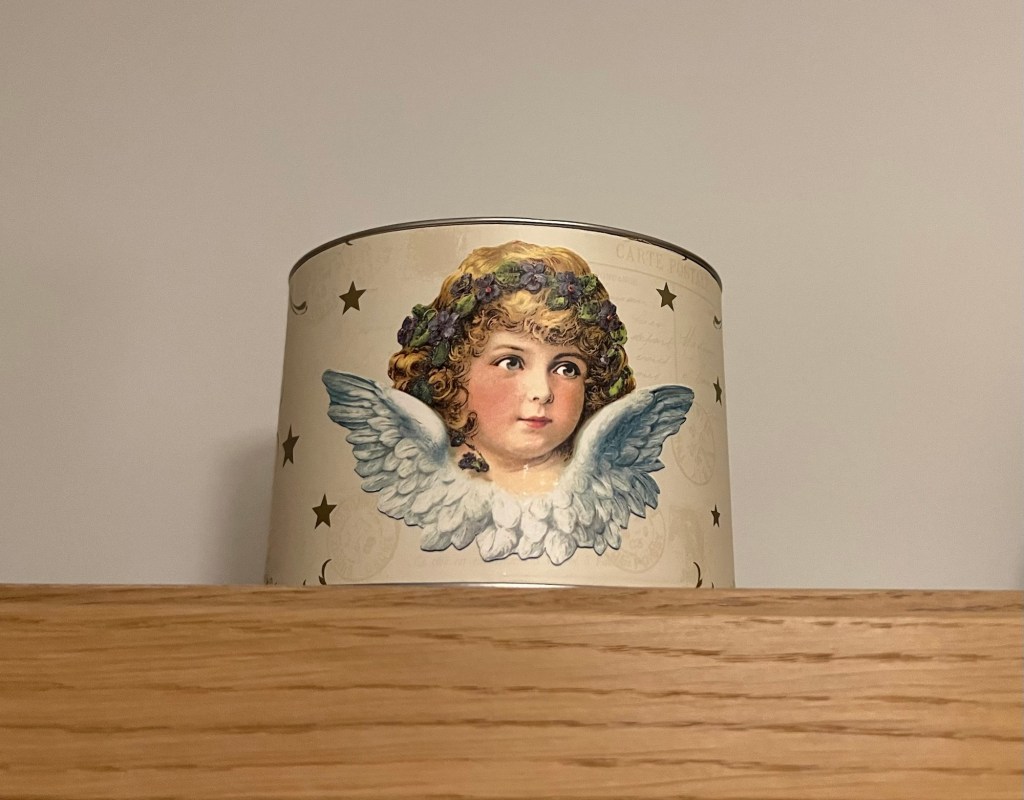 Denna runda ask har jag på min bokhylla. Jag förvarar små kort i den, kort som jag har till blombuketter jag ger bort. När jag stod här och tittade på den drog jag mig till minnes att jag fick den av mamma en gång när jag fyllde år. Hon hade köpt mig en temugg och muggen var förpackad i denna ljuvliga ask. Muggen använder jag så gott som varje dag då jag dricker te. Den är stor så det får plats mycket te i den. Jag tycker både mugg och ask är jättefina. Jag mår bra av att ha dem i min närhet. Det är fina minnen från mamma. ![]()
