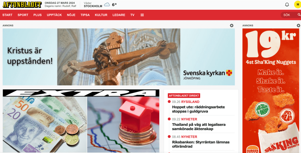 I mitt arbete som annonssäljare tycker jag det är trevligt när jag ser mina kunders annonser på Schibsteds sajter. Just nu är det extra roligt när Svenska Kyrkans annonser dyker upp. Överst på Aftonbladet proklameras att Kristus är uppstånden! Underbart!