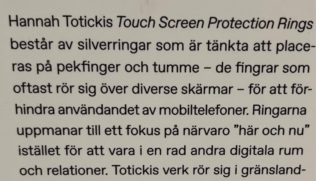 Dessa konstverk tycker jag om. Jag håller med konstnären om att när man har gäster eller när man går bort till andra ska man undvika att ha sina mobiltelefoner framme. Det är bättre att vara närvarande ”här och nu” istället för att vara i en rad andra digitala rum och relationer. Så bra uttryckt av Hannah Totickis. Vill man umgås med andra människor än dem man är tillsammans med just då är det bättre att man åker hem eller åker till dessa vänner som finns någon annanstans. Var närvarande där du är med dem du har runt omkring dig!