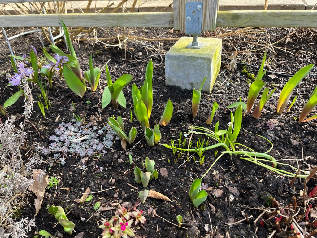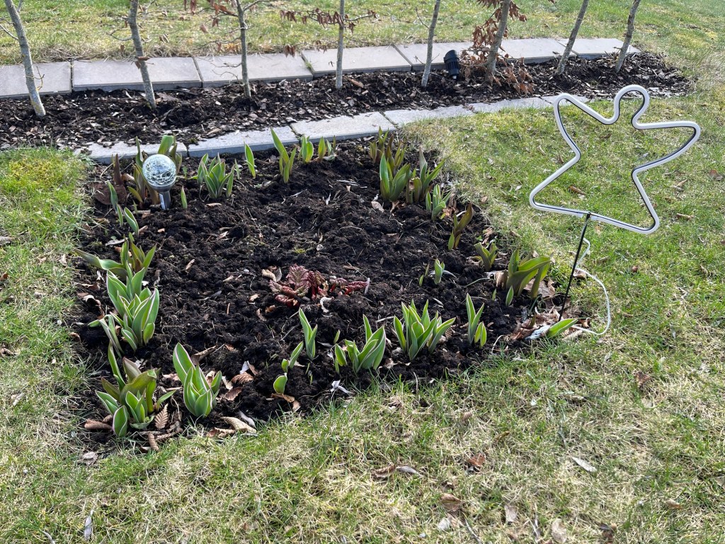 Här är mitt lilla rabarberland som jag har kantat med tulpaner.