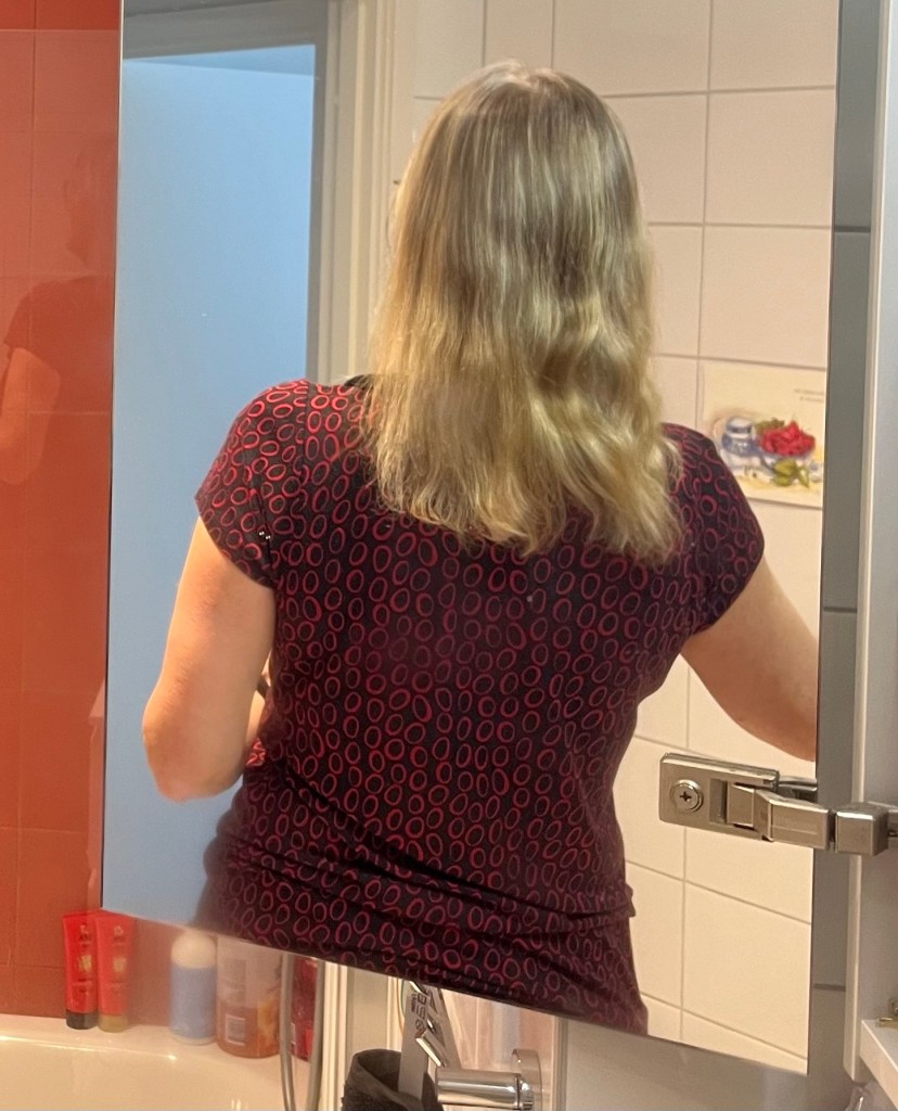 Jag har klippt (toppat) håret på ett par av mina vänner den senaste tiden. Jag kom på att jag själv skulle vilja toppklippa mitt hår utan att få det uppklippt. Jag har haft det lite uppklippt men tycker det har varit risigt. Jag kom på den geniala idén att testa att klippa mig själv. Jag ville ha det jämnt klippt och tänkte att det inte kunde vara så svårt att fixa det. Luggen brukar jag klippa men inte hela håret. Sagt och gjort! Mitt hår är tunt så det gick snabbt att klippa. Jag tycker det blev bra. Jag är mer än nöjd. Jag får se hur det ser ut om ett par veckor.