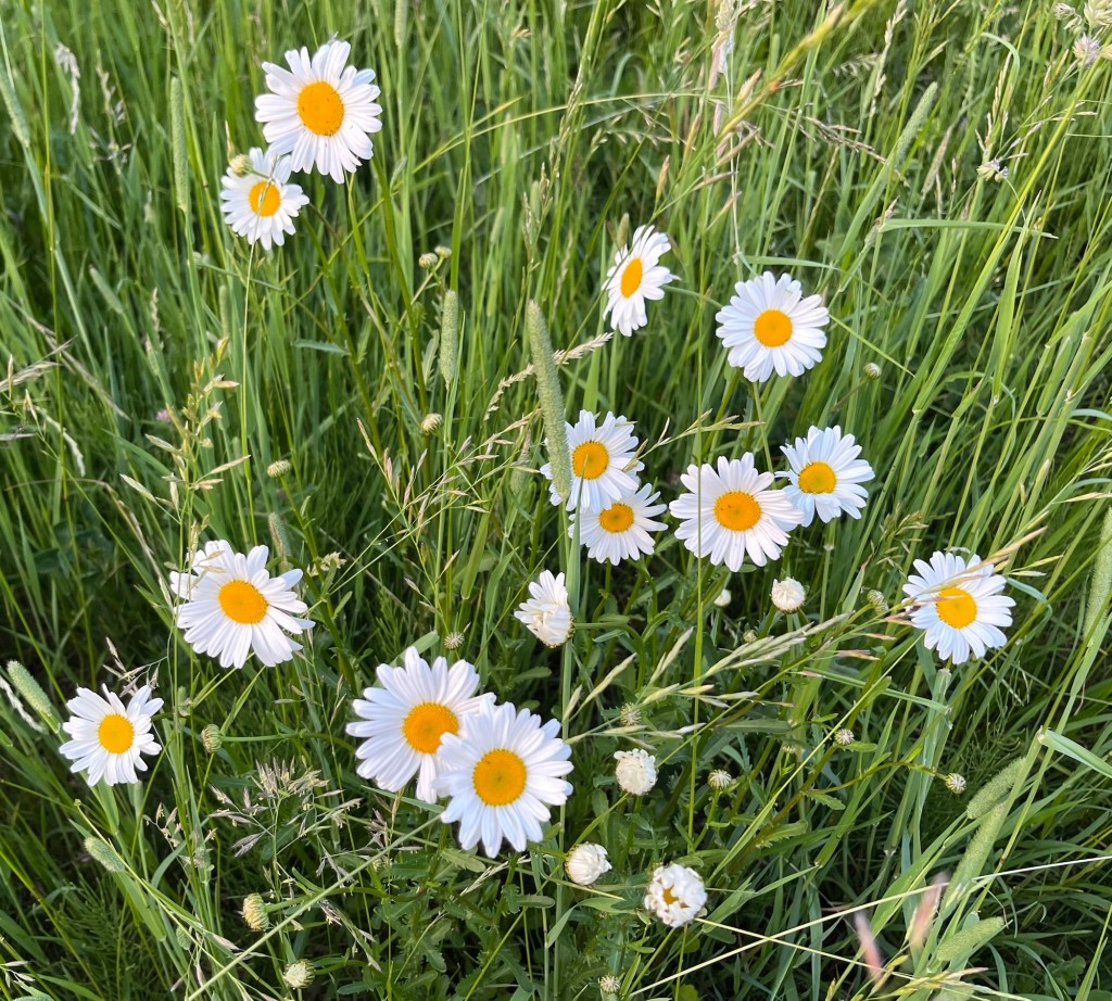 Nu är det njutbart att gå på promenad för det finns blommor överallt. På min väg runt kullen passerar jag dessa ljuvliga prästkragar som lyser så vackert. De gör mig glad.