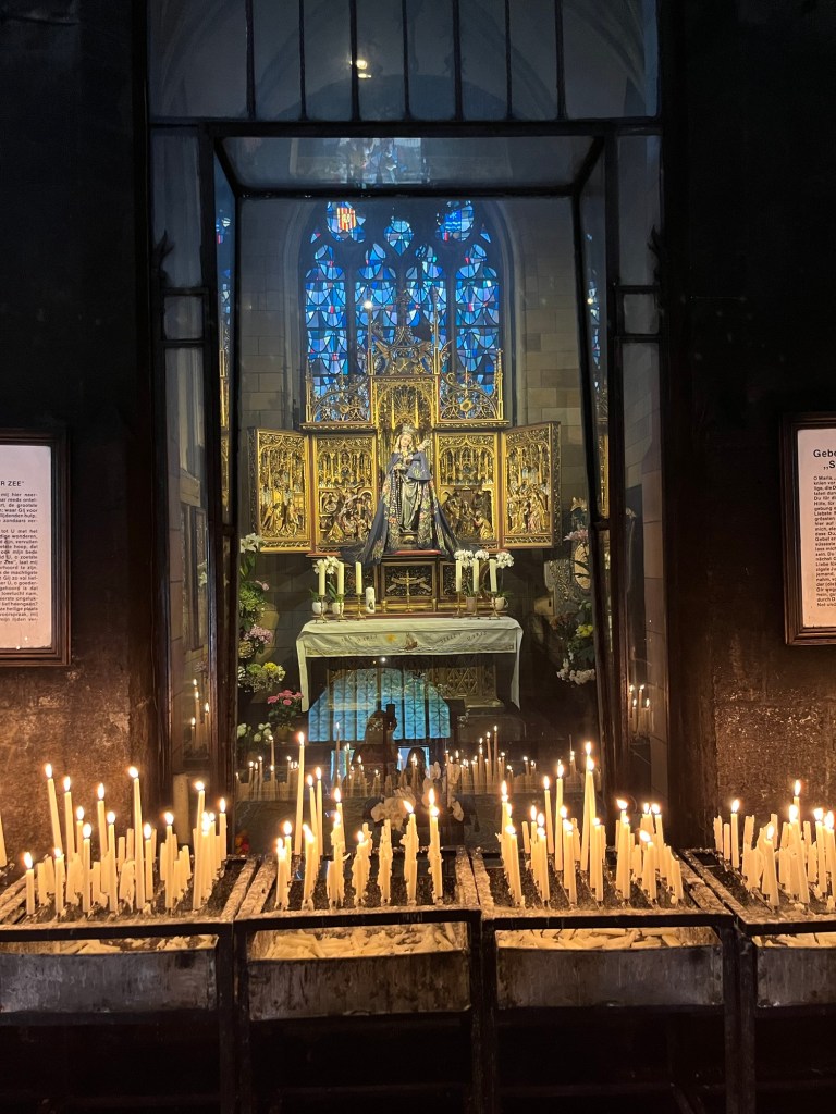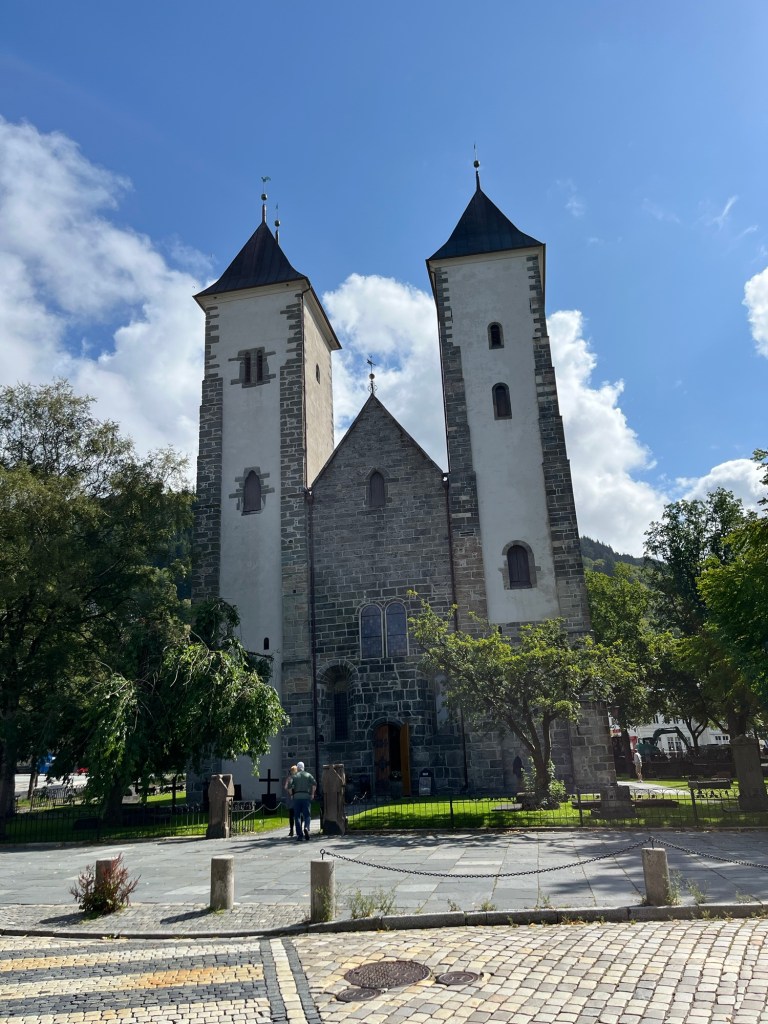Här ser vi Mariakyrkan. Den byggdes 1140 – 1180 i romansk stil och med en gotisk kort tillbyggnad. Kyrkan är den äldsta bevarade byggnaden i staden. Kyrkan var länge känd under namnet Tyskekirken. Kyrkan är huvudsakligen byggd av täljsten. Den har 310 sittplatser och är en basilika med två västtorn.