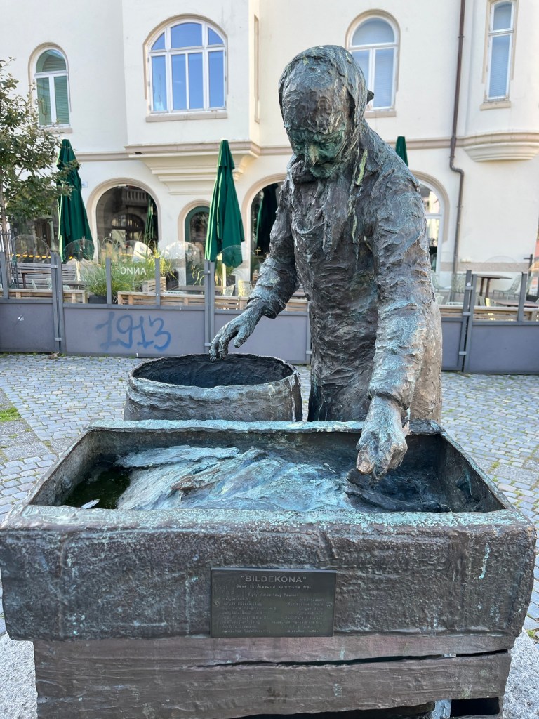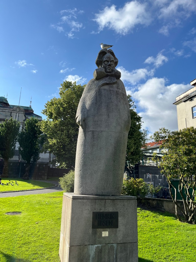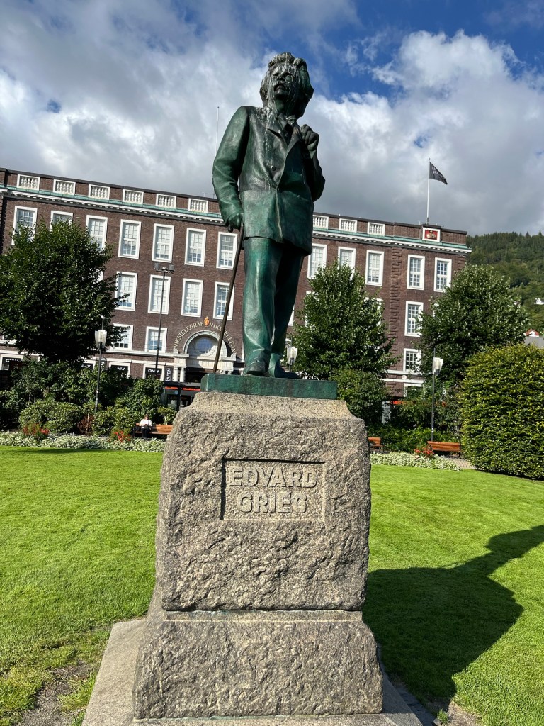 I Byparken fick jag se statyn nedan till vänster som föreställer Edvard Grieg som levde 1843 – 1907. Han var norsk tonsättare under senromantiken och Norges främsta företrädare för nationalromantiken. Han gjorde musiken till Henrik Ibsens pjäs Peer Gynt: I Bergakungens sal och och Solveigs sång och Pianokonsert i A-moll Op. 16 som är en av världens mest spelade pianokonserter.