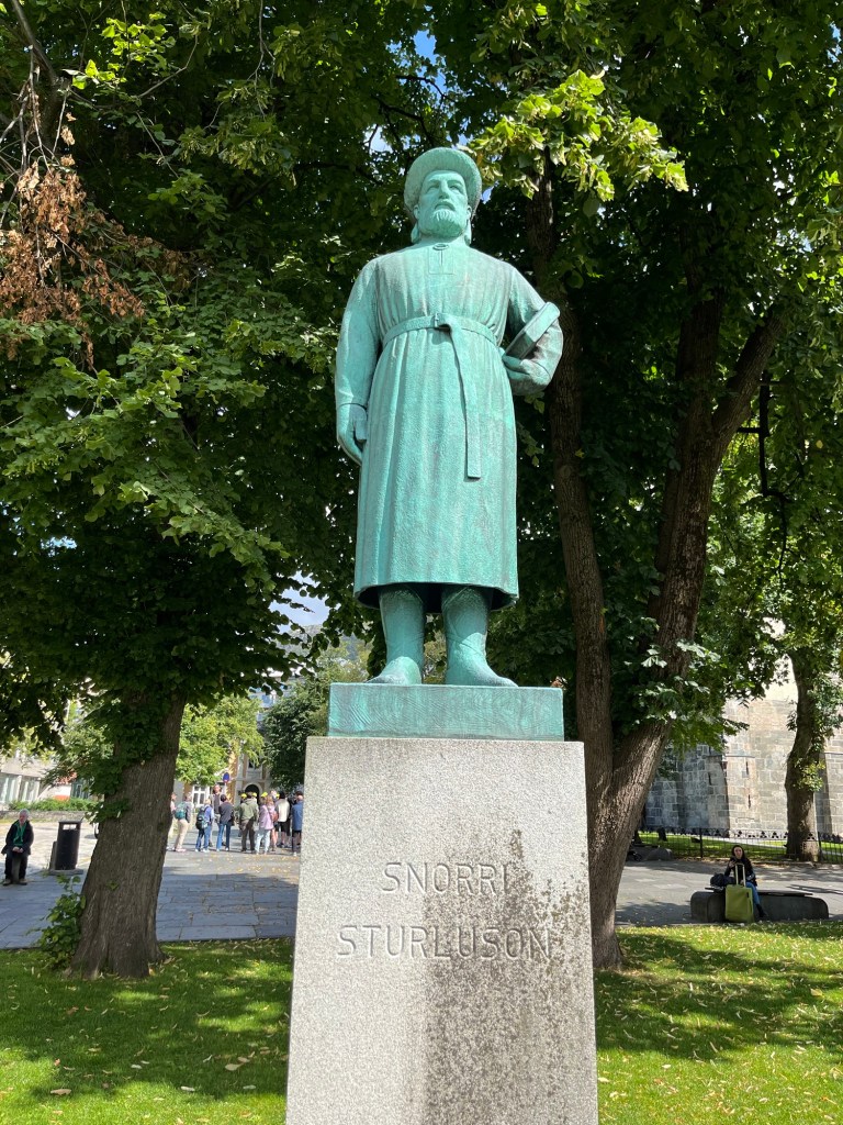 Mannen till höger är Snorre Sturlasson. Han levde i slutet på 1100-talet och början på 1200-talet. Han var en isländsk adelsman, politiker, historiker och författare. Han betraktas som författare till Den yngre Eddan som är en handbok i skaldekonst och lärobok i nordisk mytologi, författad omkring 1220. Han har också författat Heimskringla, en bok som skildrar främst Norges kungar fram till och med år 1177.