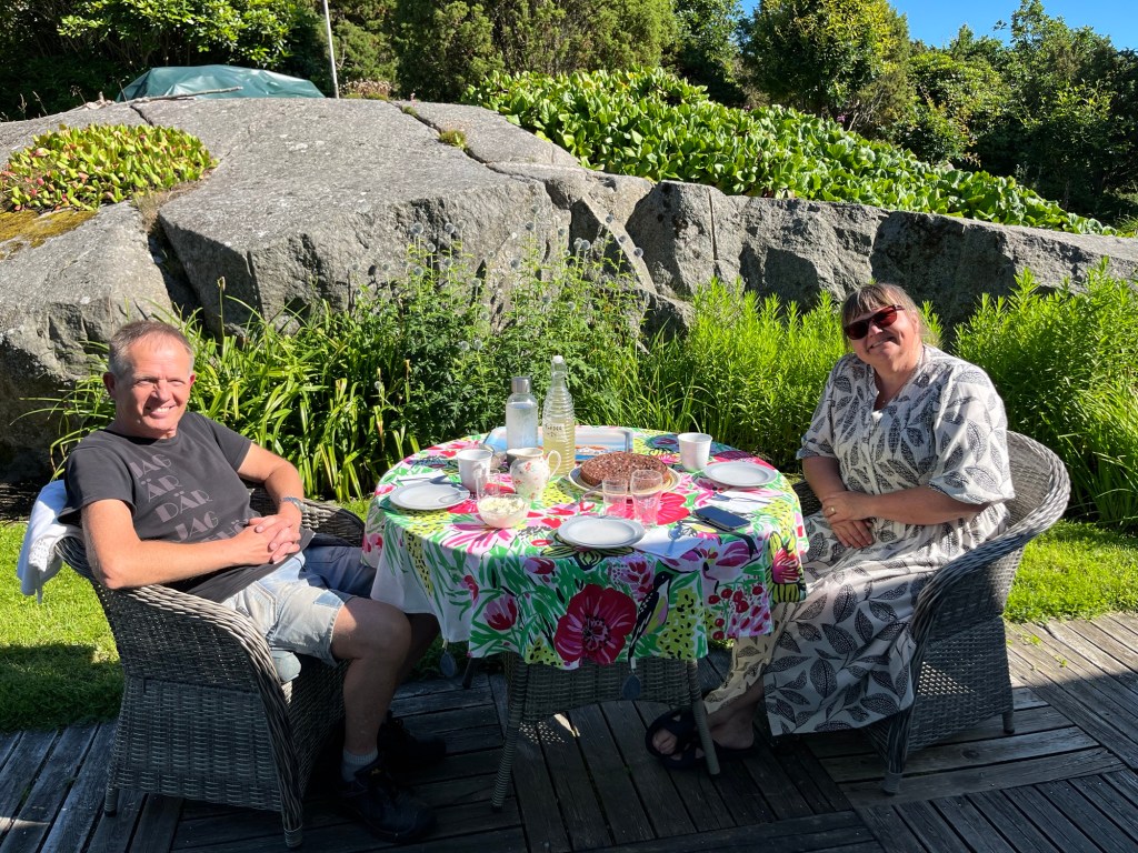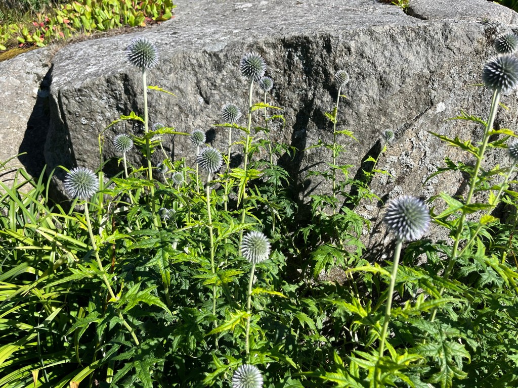 Ikväll har jag checkat in hos goda vännerna Mia och Bengt i Göteborg. Vi började med en underbar fika ute i solskenet. Här ser vi blå bolltistel som blir helt blå längre fram. Just nu gör de sig väldigt fint mot det gråa bergspartiet.